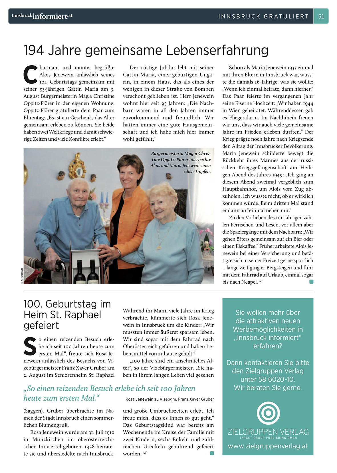„100 Jahre sind ein ansehnliches Alter“, so der Vizebürgermeister. „Sie haben in Ihrem langen Leben viel gesehen