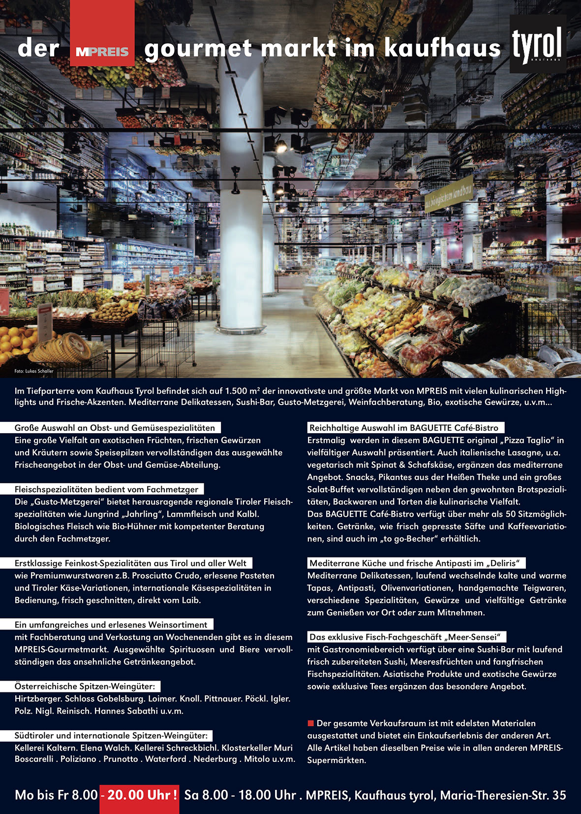 Im Tiefparterre vom Kaufhaus Tyrol befindet sich auf 1.500 m2 der innovativste und größte Markt von MPREIS mit vielen kulinarischen Highlights und Frische-Akzenten. Mediterrane Delikatessen, Sushi-Bar, Gusto-Metzgerei, Weinfachberatung, Bio, exotische Gewürze, u.v.m...