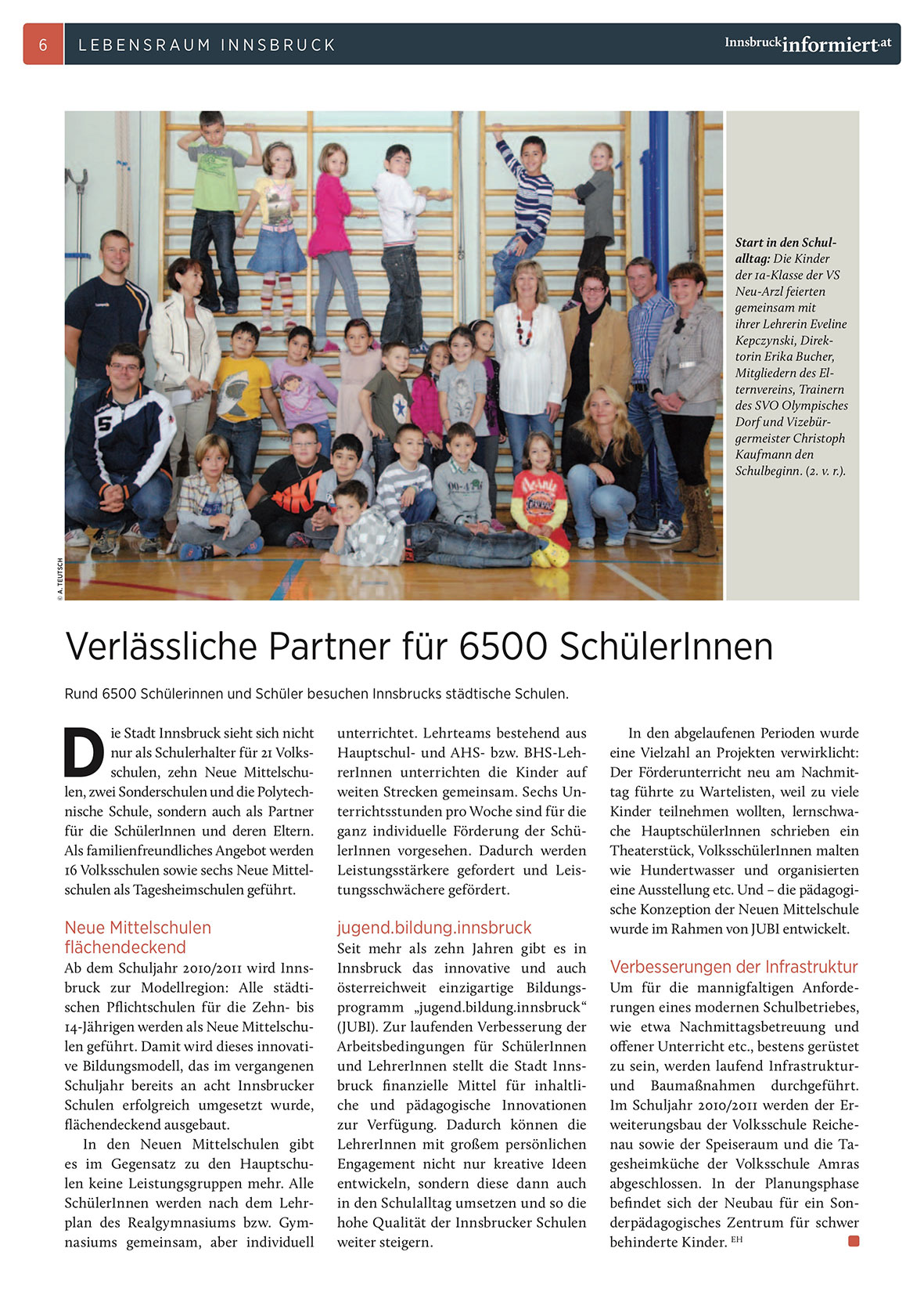 Ab dem Schuljahr 2010/2011 wird Innsbruck zur Modellregion: Alle städtischen Pflichtschulen für die Zehn- bis