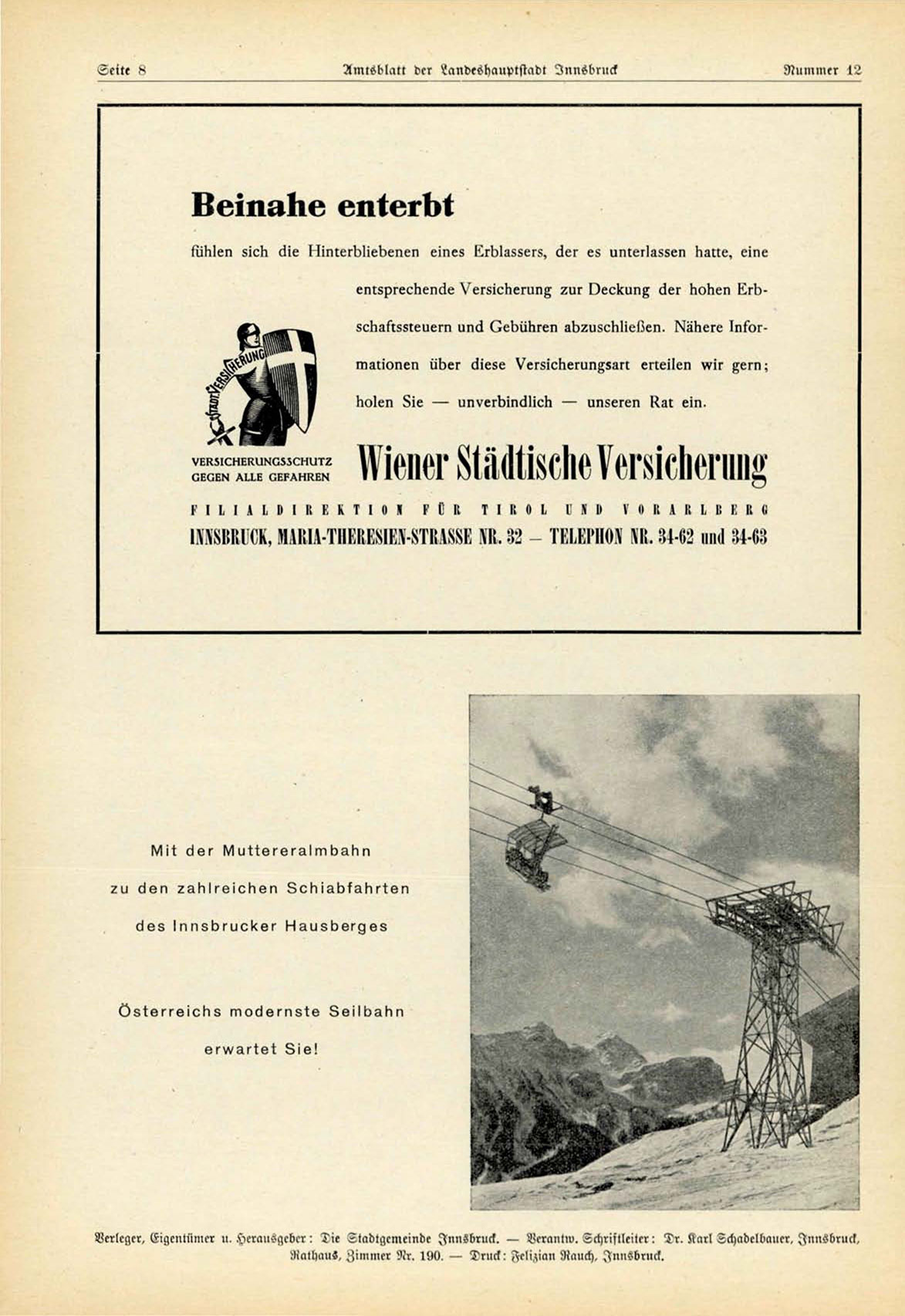 Verleger, Eigentümer u. Hcran^qcbcr: Tie Ttadl^cincinde Innsbruck. — ^ r a n l w . ^chrisllcilrr: Tr. ilarl Tchadell"lNier, Innsbruck,
