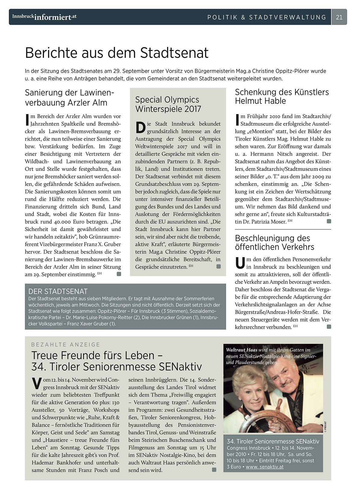 Stadtsenat wie folgt zusammen: Oppitz-Plörer – Für Innsbruck (3 Stimmen), Sozialdemokratische Partei – Dr. Marie-Luise Pokorny-Reitter (2), Die Innsbrucker Grünen (1), Innsbrucker Volkspartei – Franz Xaver Gruber (1).