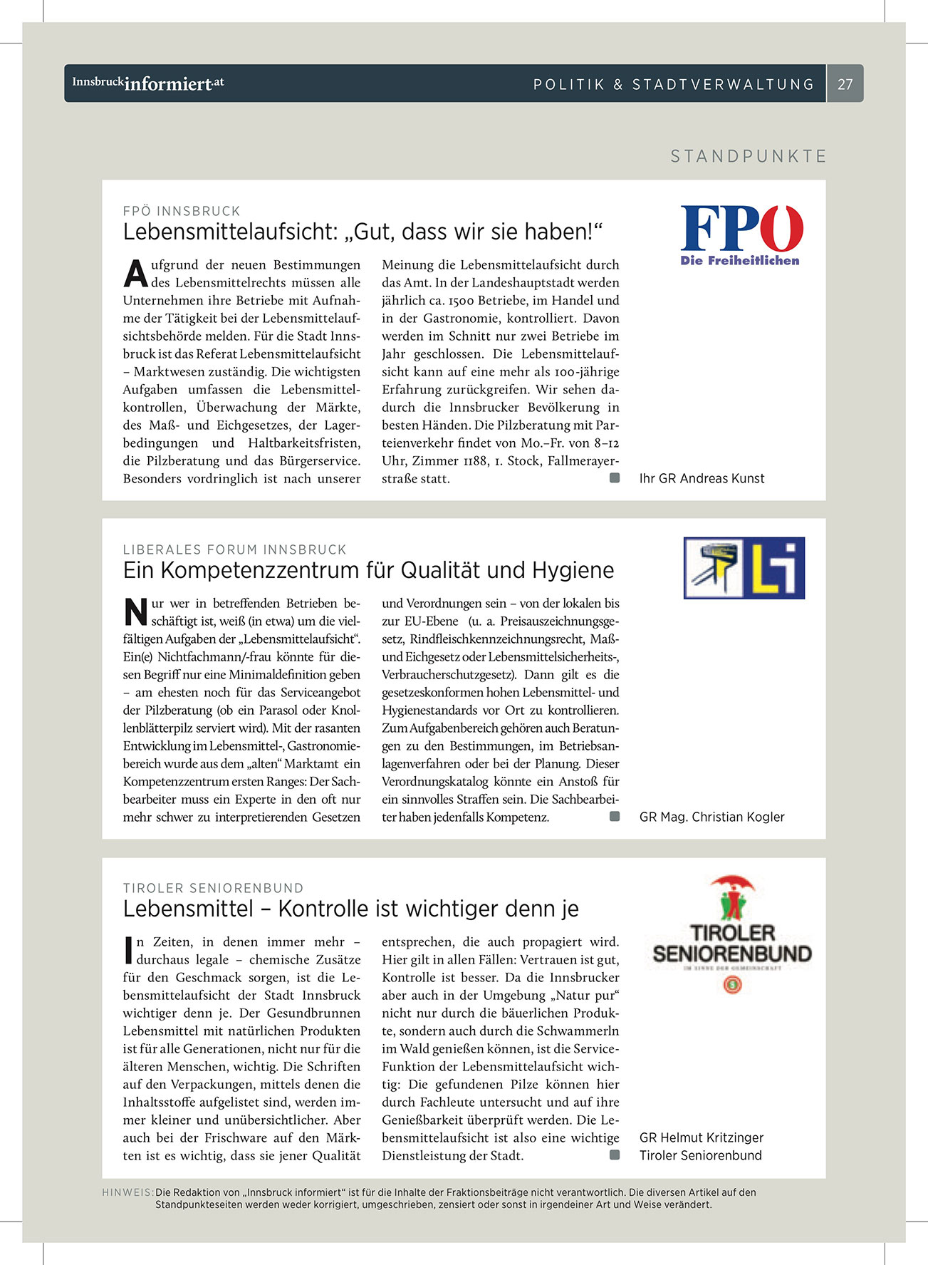 HIN W EIS : Die Redaktion von „Innsbruck informiert“ ist für die Inhalte der Fraktionsbeiträge nicht verantwortlich. Die diversen Artikel auf den