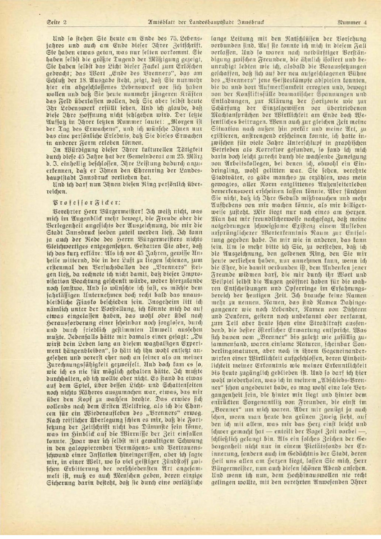 In Würdigung dieser Ihrer kulturellen Tätigkeit durch diese 45 Jahre hat der Gemeinderat am 25. März d. J. einhellig beschlossen, Ihre Leistung dadurch anzuerkennen, daß er Ihnen den Ehrenring der Landeshauptstadt Innsbruck verliehen hat.