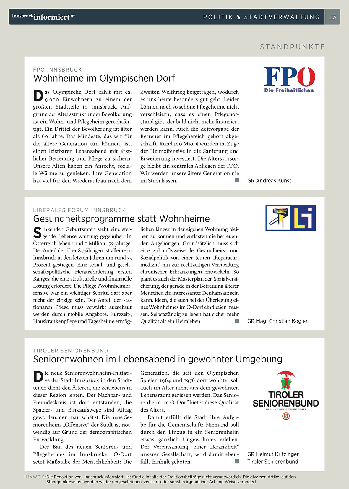 H I N W E I S : Die Redaktion von „Innsbruck informiert“ ist für die Inhalte der Fraktionsbeiträge nicht verantwortlich. Die diversen Artikel auf den