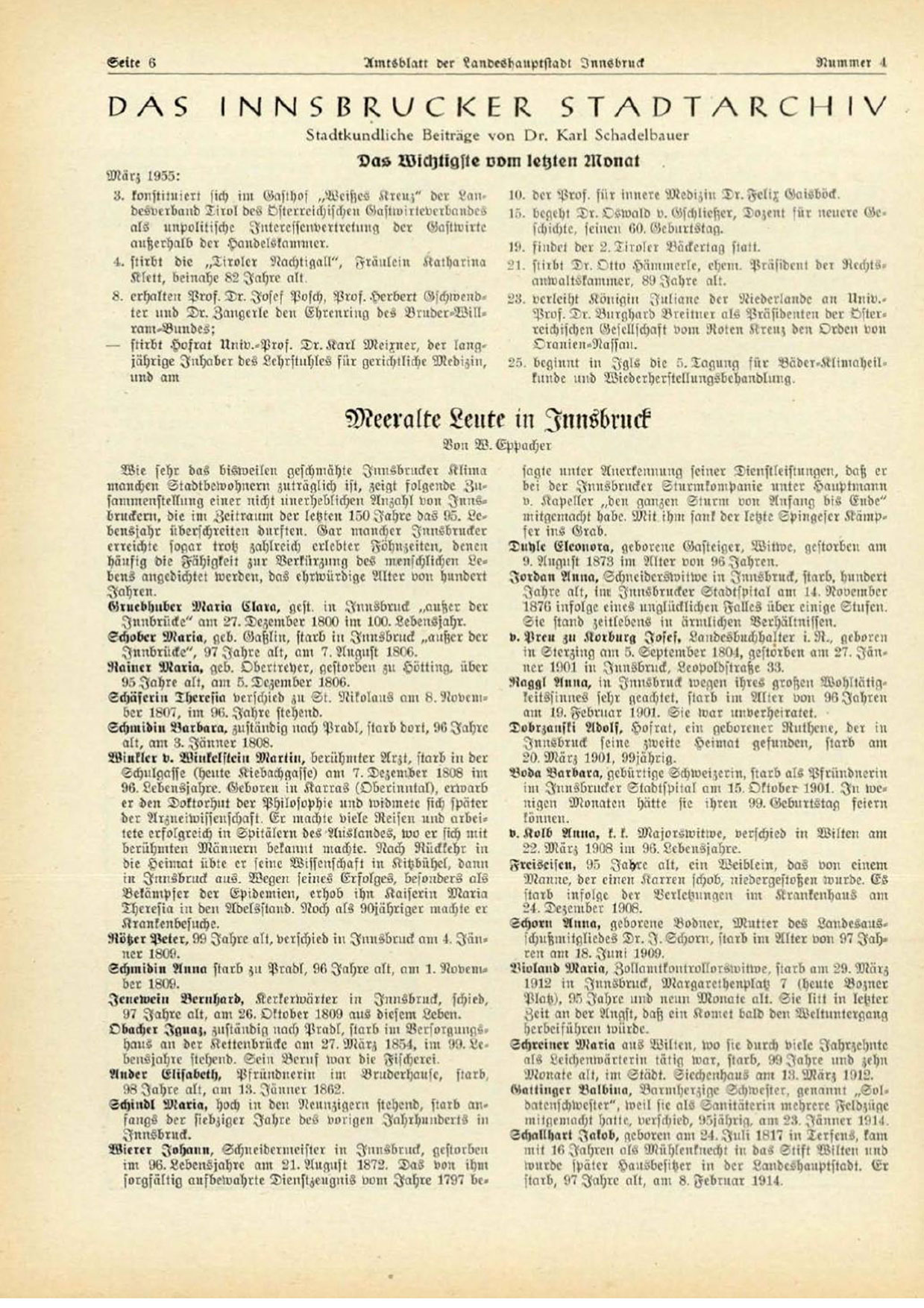 Wie sehr das bisweilen geschmähte Innsbrucker Klima manchen Stadtbewohnern zuträglich ist, zeigt folgende Zusammenstellung einer nicht unerheblichen Anzahl von bruckern, die im Zeitraum der letzten 150 Jahre das 95. Lebensjahr überschreiten durften. Gar mancher Innsbrucker erreichte sogar trotz zahlreich erlebter Föhnzeiten, denen häufig die Fähigkeit zur Verkürzung des