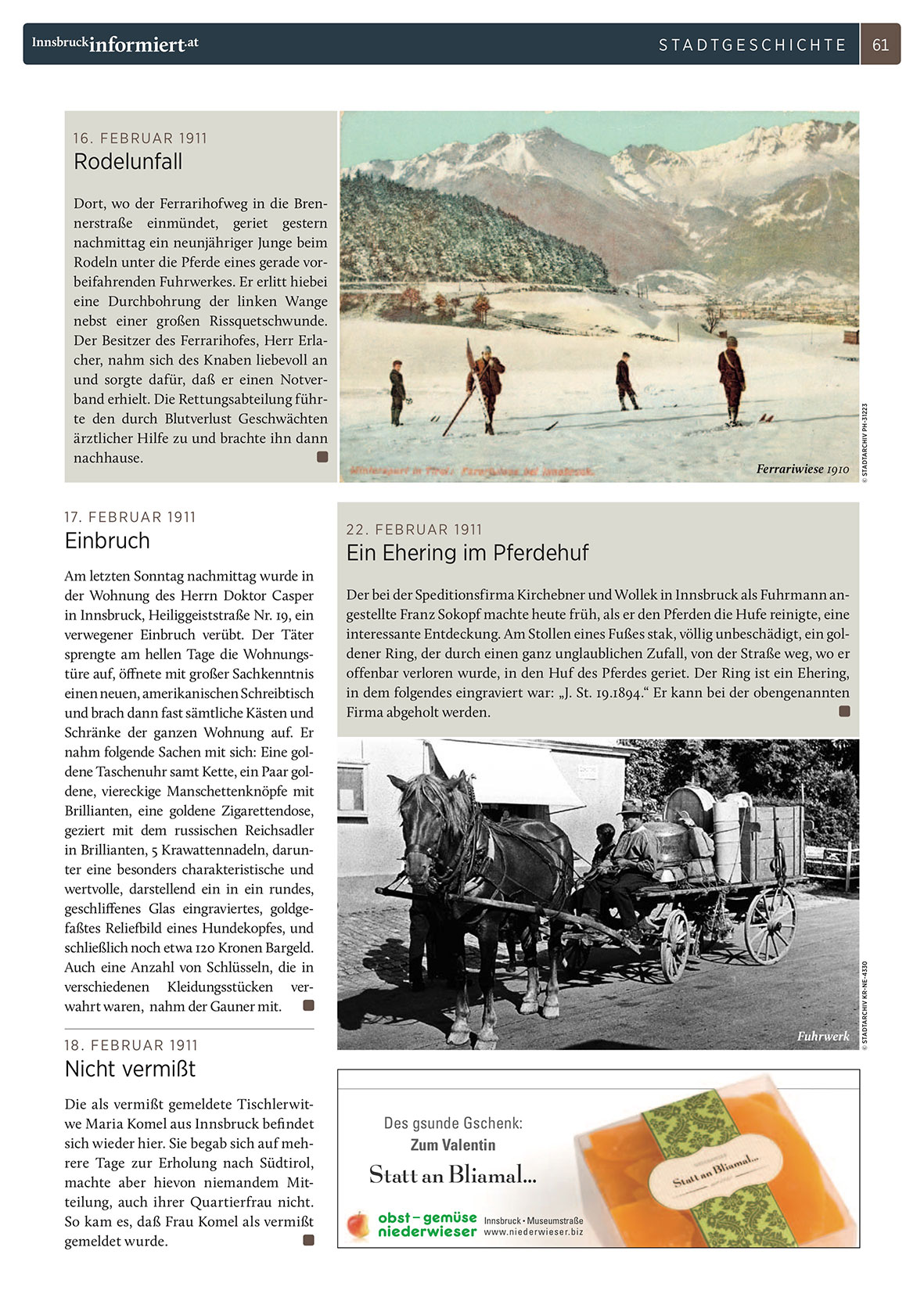Der bei der Speditionsfirma Kirchebner und Wollek in Innsbruck als Fuhrmann angestellte Franz Sokopf machte heute früh, als er den Pferden die Hufe reinigte, eine