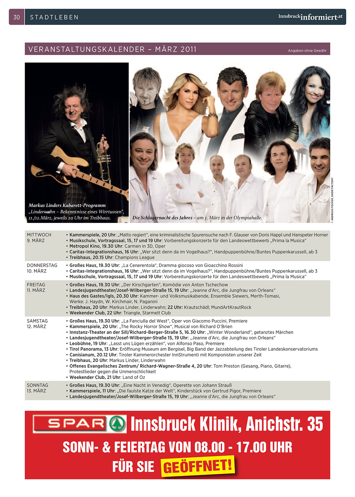 • Haus des Gastes/Igls, 20.30 Uhr: Kammer- und Volksmusikabende, Ensemble Siewers, Merth-Tomasi,