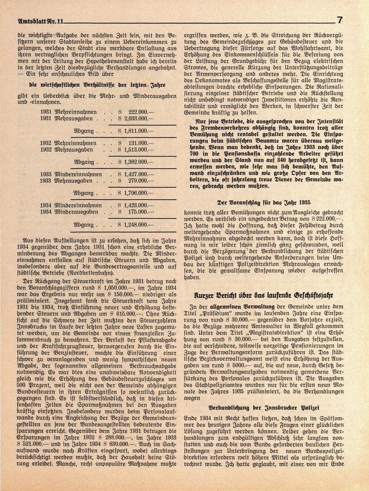 kräftig einsetzten. Insbesondere wurden be5m Personalaufwande durch eine Angleichung der Bezüge der Gemeindeangestellten an jene der Bundesangestellten bedeutende Einsparungen erreicht. Gegenüber dem Jahre 1931 betrugen die