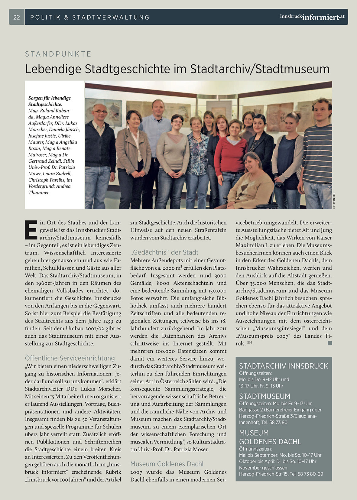an Interessierten. Zu den Veröffentlichungen gehören auch die monatlich im „Innsbruck informiert“ erscheinende Rubrik