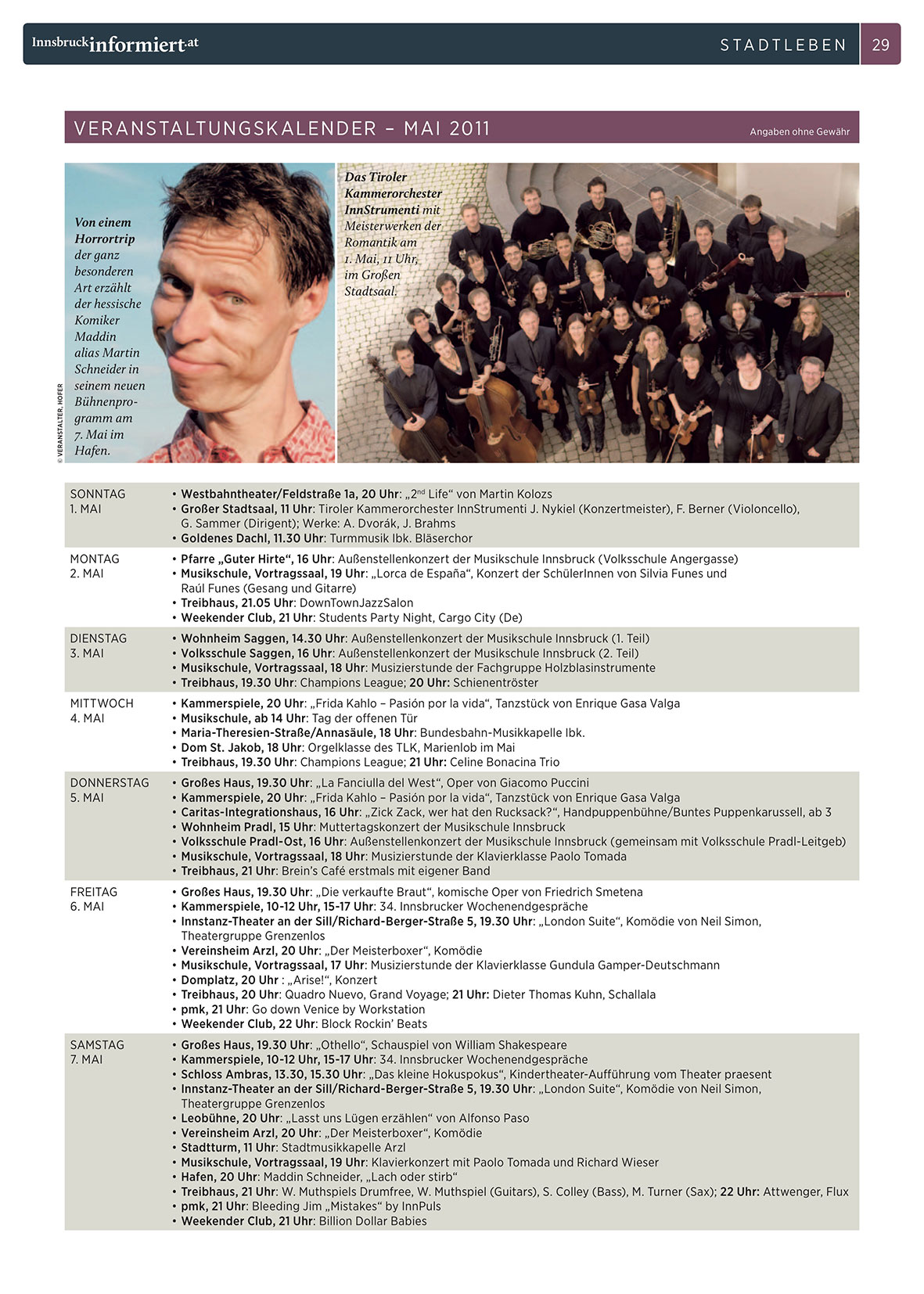 • Großer Stadtsaal, 11 Uhr: Tiroler Kammerorchester InnStrumenti J. Nykiel (Konzertmeister), F. Berner (Violoncello),