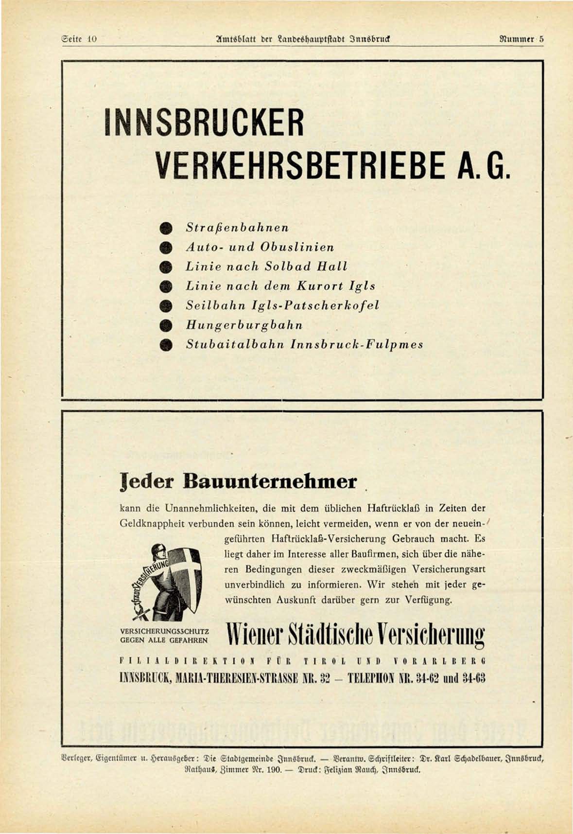 Verleger, Eigentümer u. Herausgeber: Die Stadtgemeinde Innsbruck. — Verantw. Schriftleiter: Dr. Karl Schadclbauer, Innsbruck,