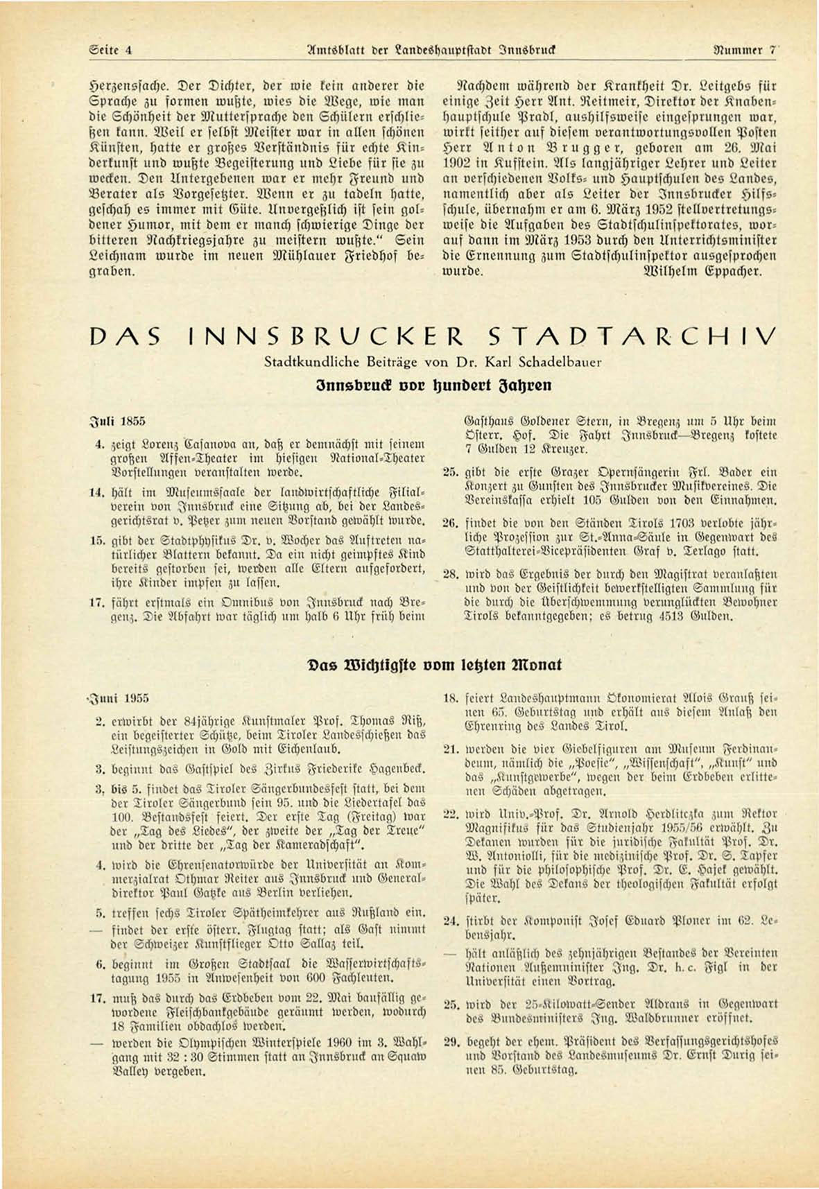 namentlich aber als Leiter der Innsbructer Hilfsschule, übernahm er am 6. März 1W2 stelloertretungsweise die Aufgaben des Stadtschulinspettorales. worauf dann im März IW."l durch den Unterrichlsminister