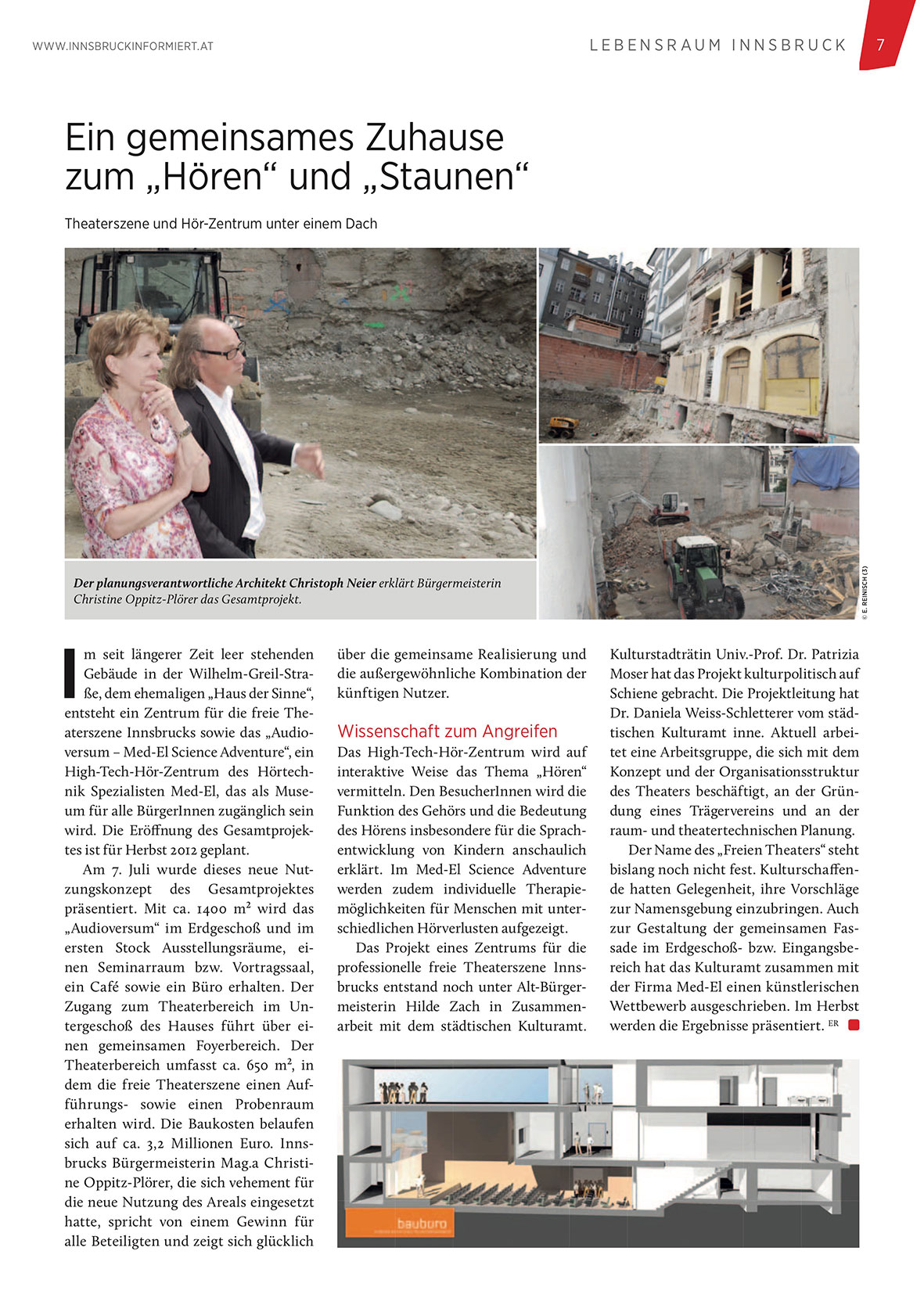 entsteht ein Zentrum für die freie Theaterszene Innsbrucks sowie das „Audioversum – Med-El Science Adventure“, ein