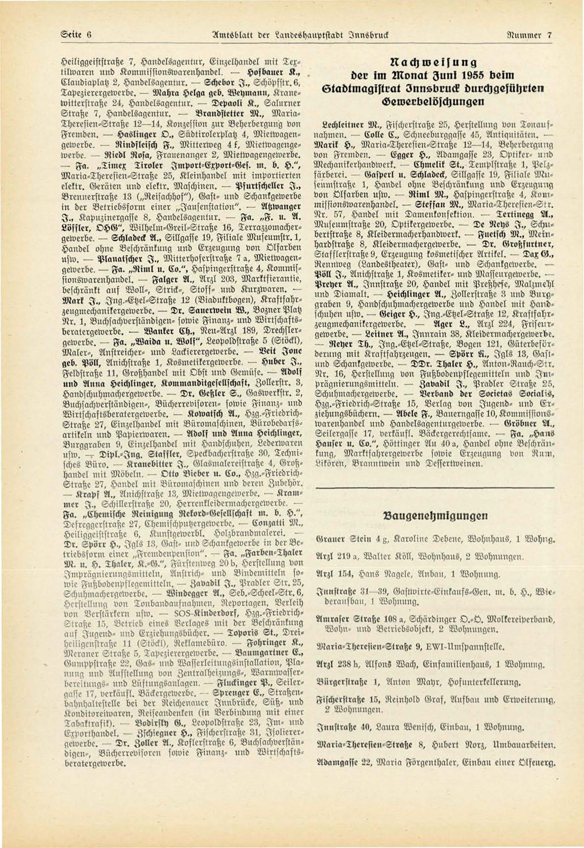 uud Diamalt. — Heichlinger A., ZoNerstraße 3 uud Burggraben 9, Handschuhmachergewcrbe und Handel mit Handschuhen usw. — Geiger H., Ing.-Etzel-Straße 12, Kraftfahrzeugmechauikcrgewerbe. — Ager L., Arzl 224, FriseuTgewerbe. — Leitner A.» Iunrain 38, Kleidcrmachergewerbe.