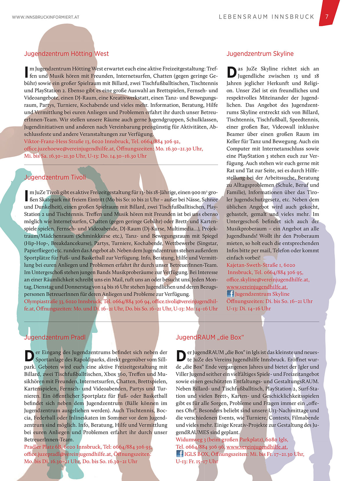 Olympiastraße 33, 6020 Innsbruck, Tel. 0664/884 306 94, office.tivoli@vereinjugendhilfe.at, Öffnungszeiten: Mo. und Di. 16–21 Uhr, Do. bis So. 16–21 Uhr, U-13: Mo. 14–16 Uhr