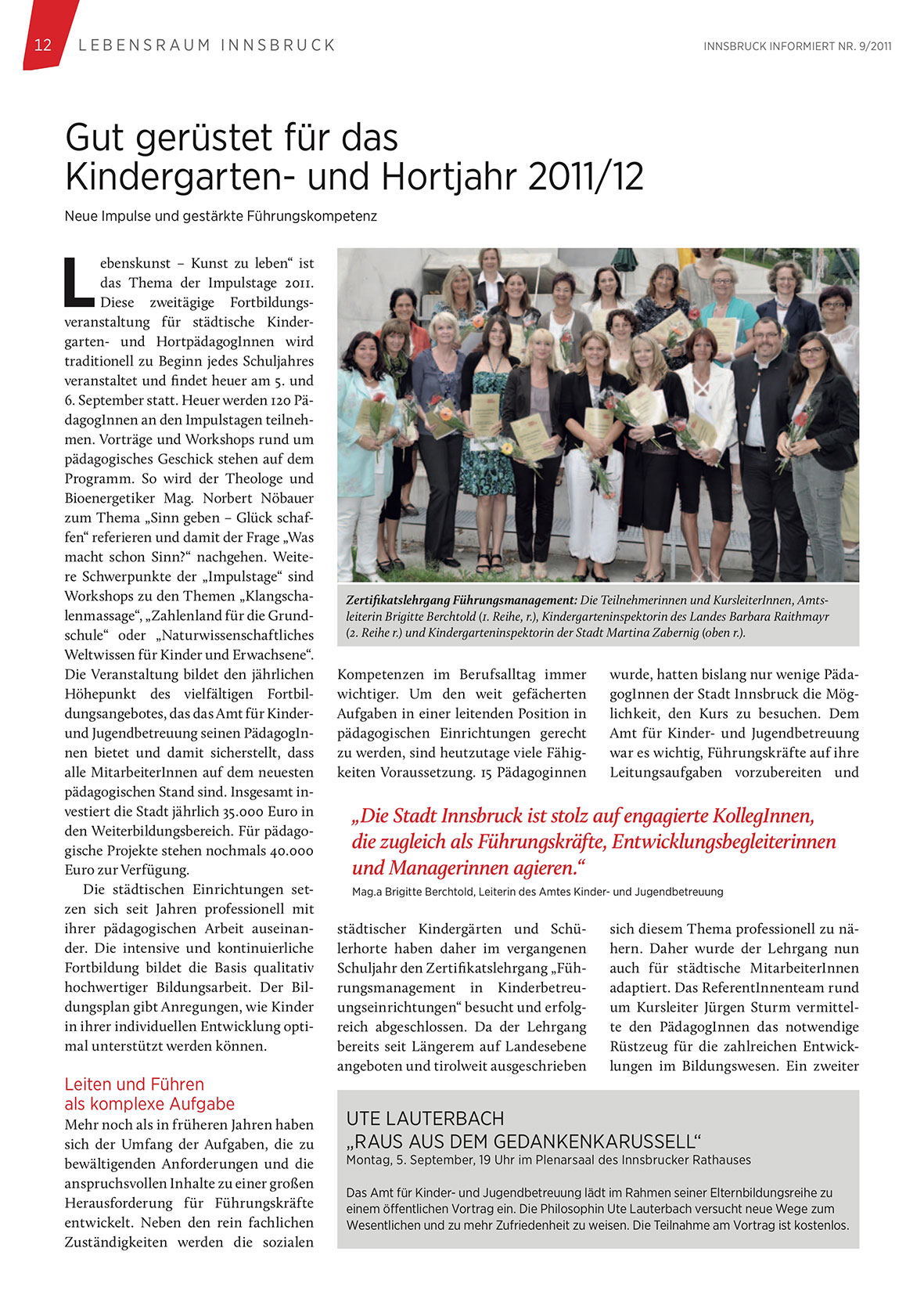 Schuljahr den Zertifikatslehrgang „Führungsmanagement in Kinderbetreuungseinrichtungen“ besucht und erfolgreich abgeschlossen. Da der Lehrgang