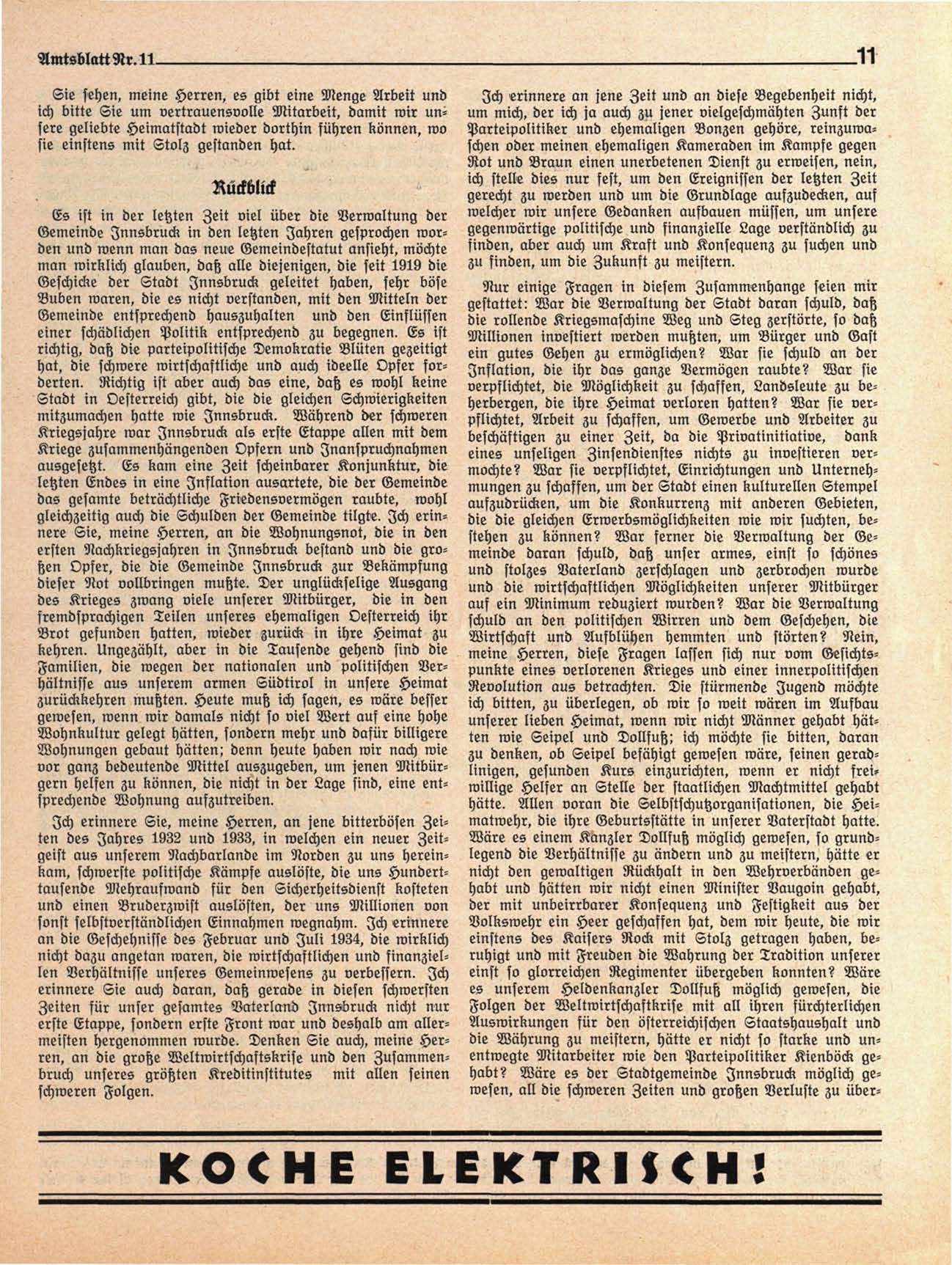die Währung zu meistern, hätte er nicht so starke und unentwegte Mitarbeiter wie den Parteipolitiker Kienoöck gehabt? Wäre es der Stadtgemeinde Innsbruck möglich gewesen, all die schweren Zeiten und grotzen Verluste zu über-