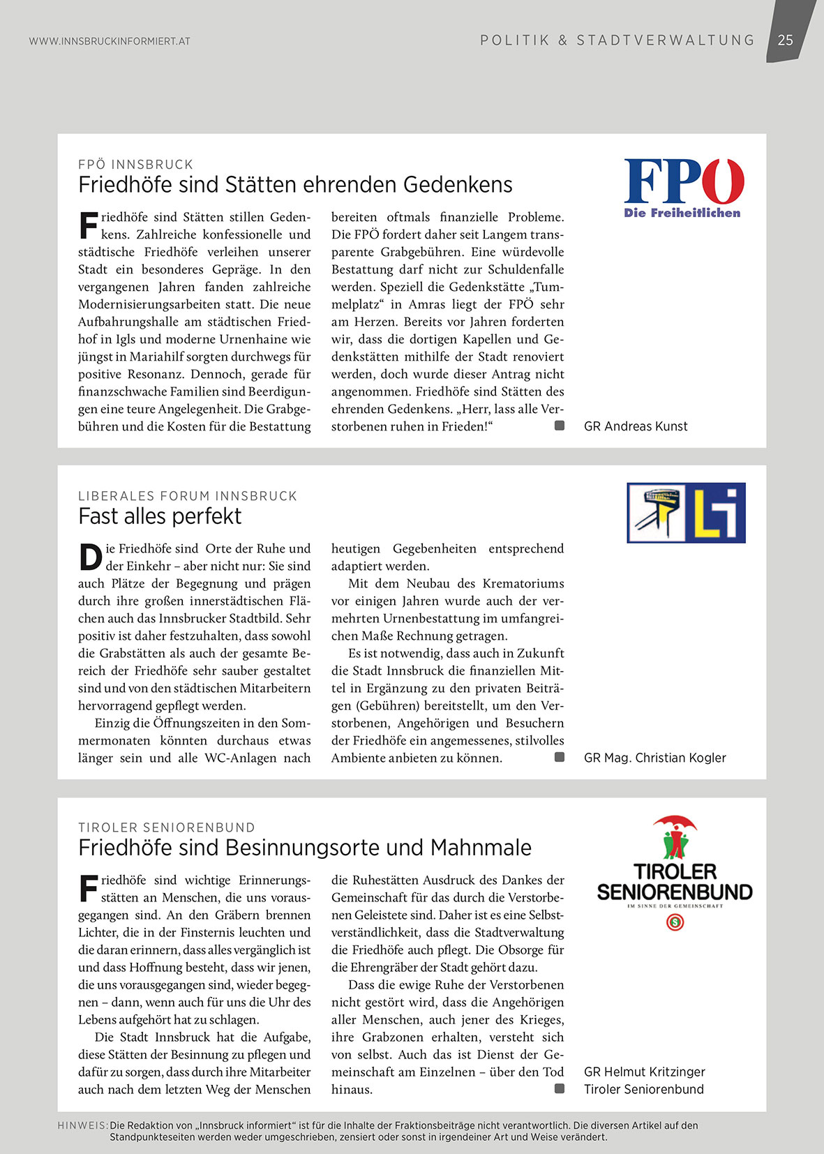 HINWEIS : Die Redaktion von „Innsbruck informiert“ ist für die Inhalte der Fraktionsbeiträge nicht verantwortlich. Die diversen Artikel auf den