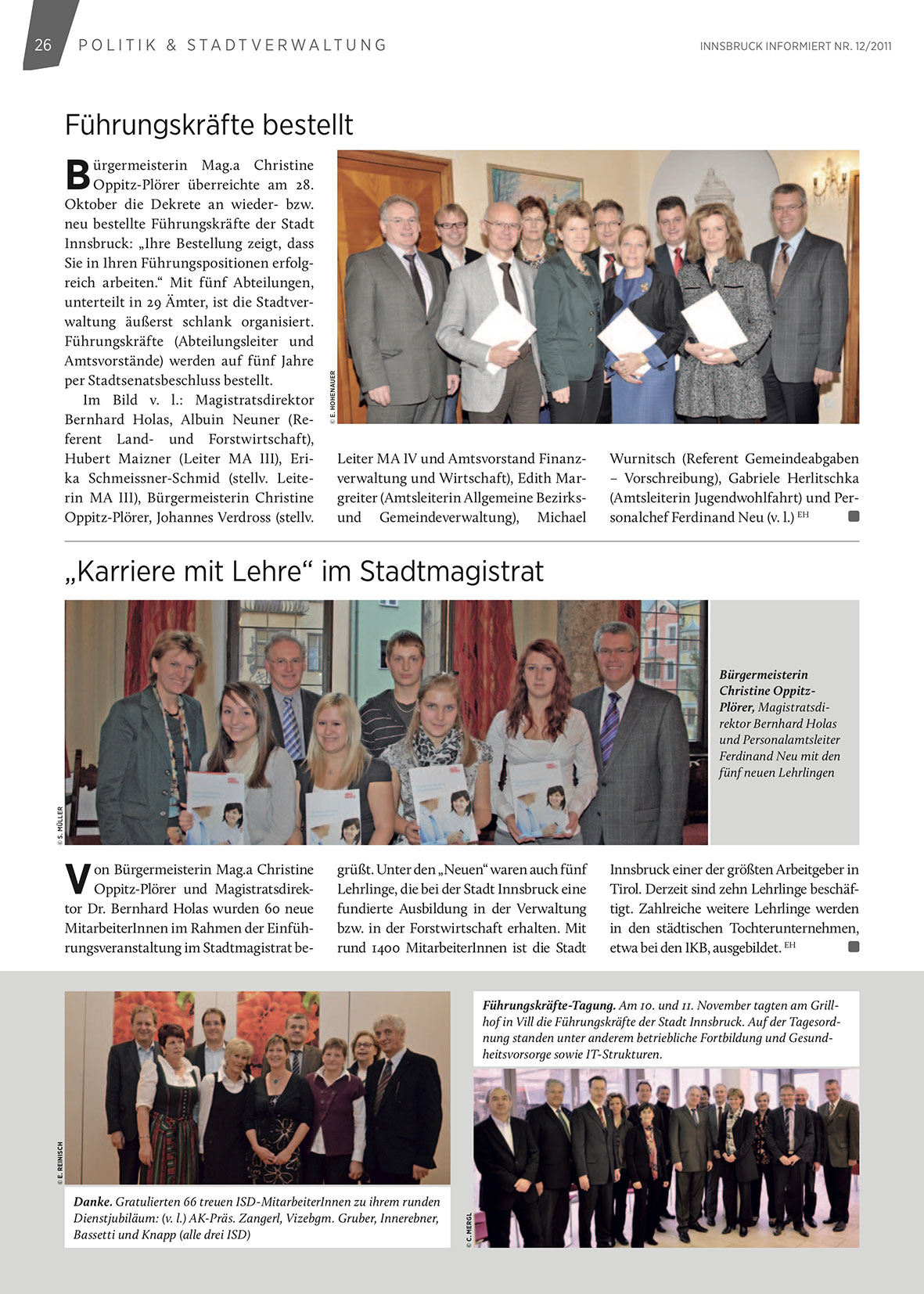Führungskräfte-Tagung. Am 10. und 11. November tagten am Grillhof in Vill die Führungskräfte der Stadt Innsbruck. Auf der Tagesordnung standen unter anderem betriebliche Fortbildung und Gesundheitsvorsorge sowie IT-Strukturen.