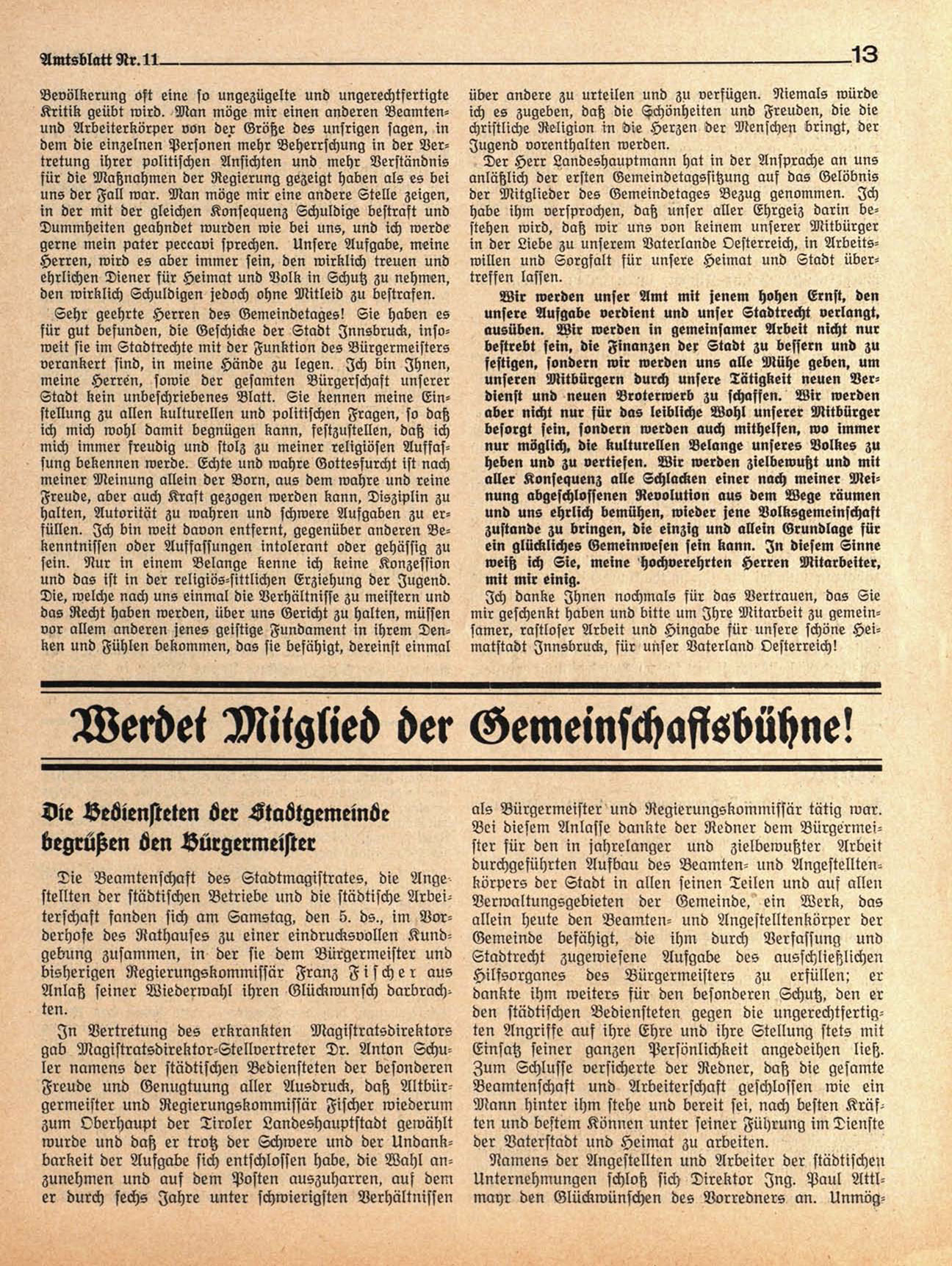 mir gefchenkt haben und bitte um Ihre Mitarbeit zu gemeinsamer, rastloser Arbeit und Hingabe für unfere fchöne Heimatstadt Innsbruck, für unfer Vaterland Oesterreich!