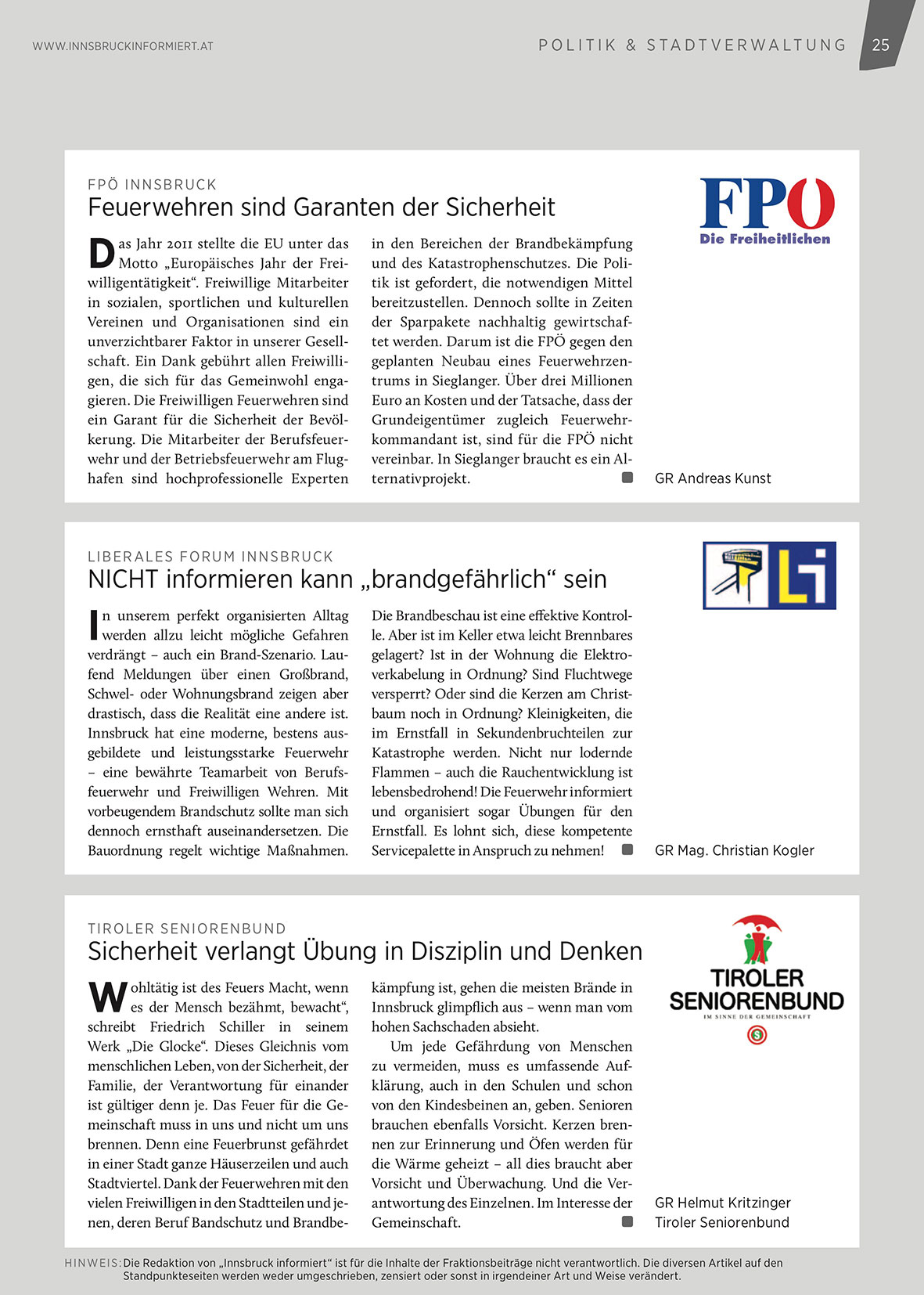 HINWEIS : Die Redaktion von „Innsbruck informiert“ ist für die Inhalte der Fraktionsbeiträge nicht verantwortlich. Die diversen Artikel auf den