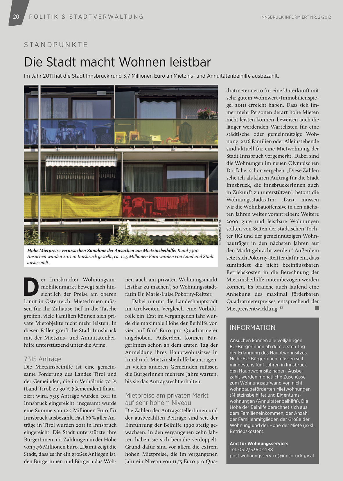 Im Jahr 2011 hat die Stadt Innsbruck rund 3,7 Millionen Euro an Mietzins- und Annuitätenbeihilfe ausbezahlt.