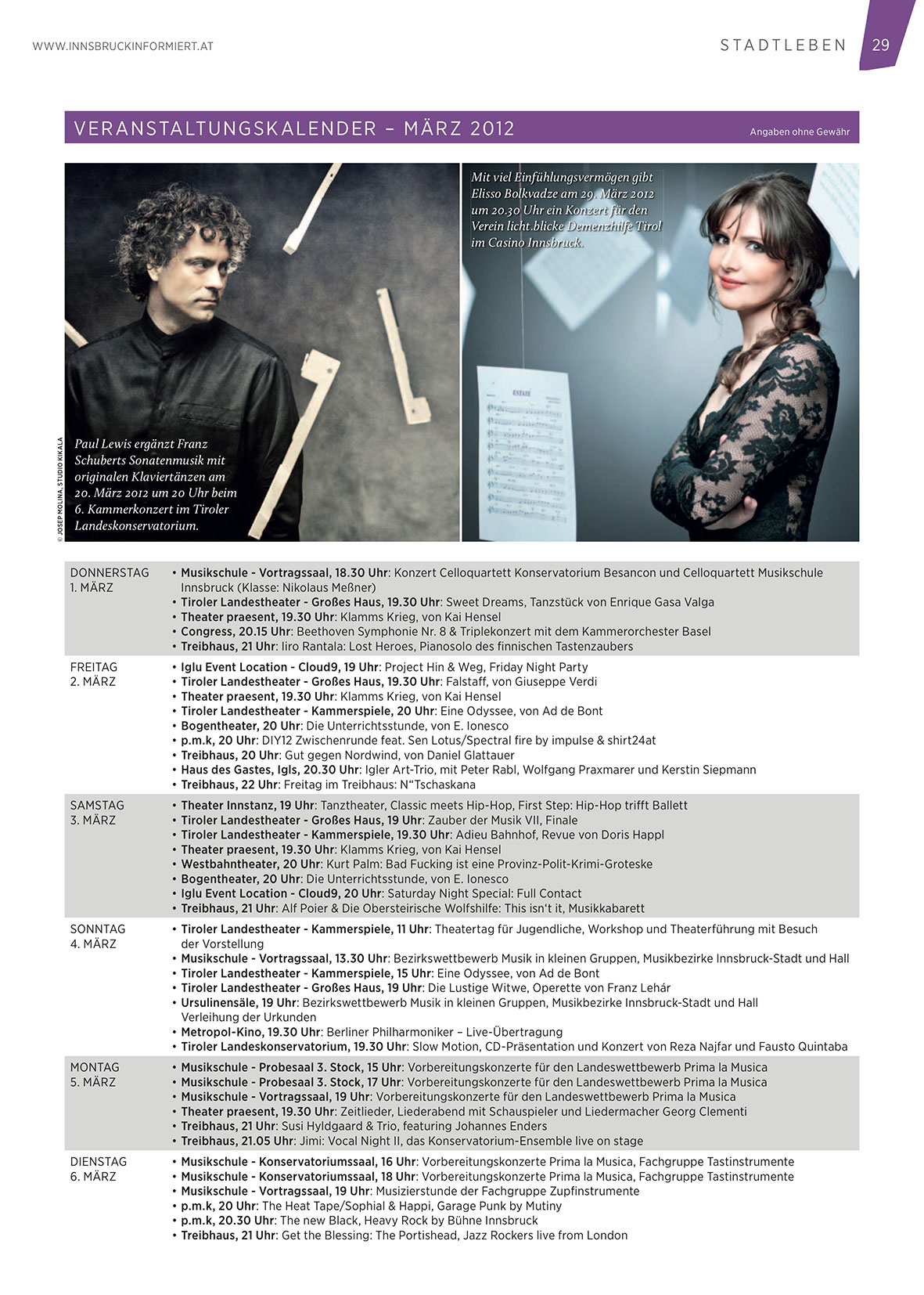 • Ursulinensäle, 19 Uhr: Bezirkswettbewerb musik in kleinen gruppen, musikbezirke innsbruck-stadt und hall