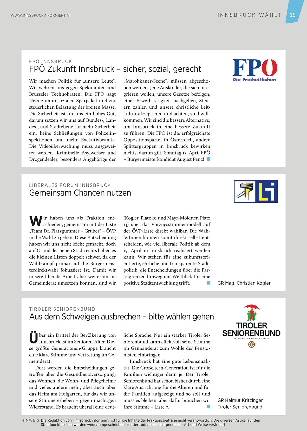 HINWEIS : Die Redaktion von „Innsbruck informiert“ ist für die Inhalte der Fraktionsbeiträge nicht verantwortlich. Die diversen Artikel auf den