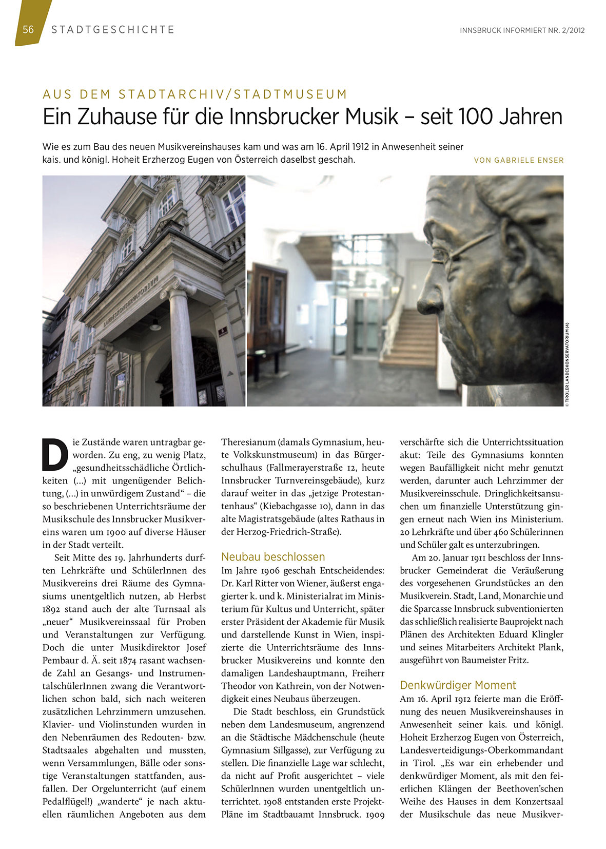 und darstellende Kunst in Wien, inspizierte die Unterrichtsräume des Innsbrucker Musikvereins und konnte den