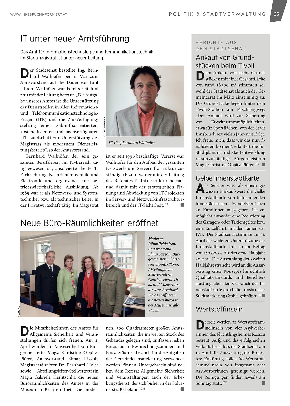 er Stadtsenat bestellte Ing. Bernhard Wallnöfer per 1. Mai zum