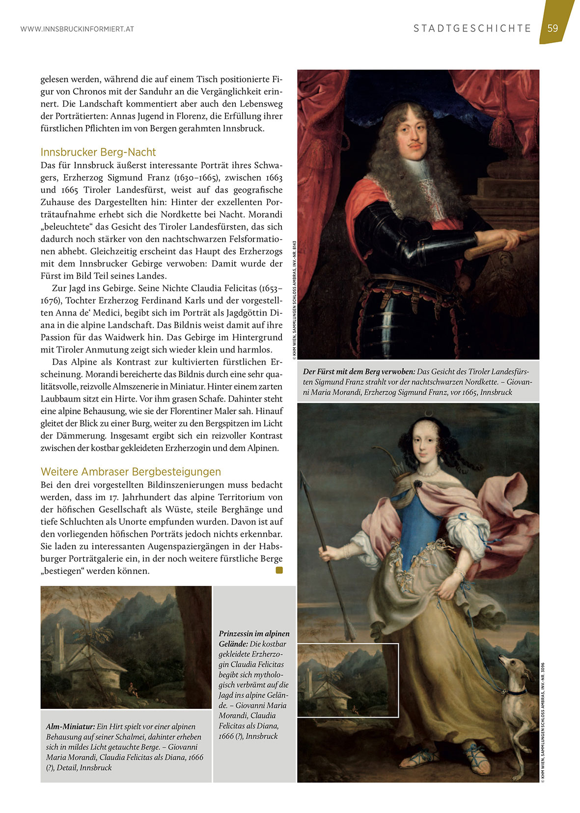 1676), Tochter Erzherzog Ferdinand Karls und der vorgestellten Anna de‘ Medici, begibt sich im Porträt als Jagdgöttin Diana in die alpine Landschaft. Das Bildnis weist damit auf ihre