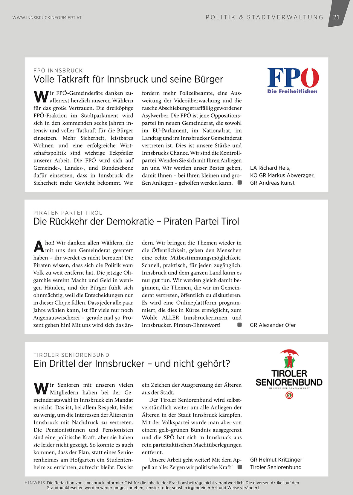 HINWEIS : Die Redaktion von „Innsbruck informiert“ ist für die Inhalte der Fraktionsbeiträge nicht verantwortlich. Die diversen Artikel auf den