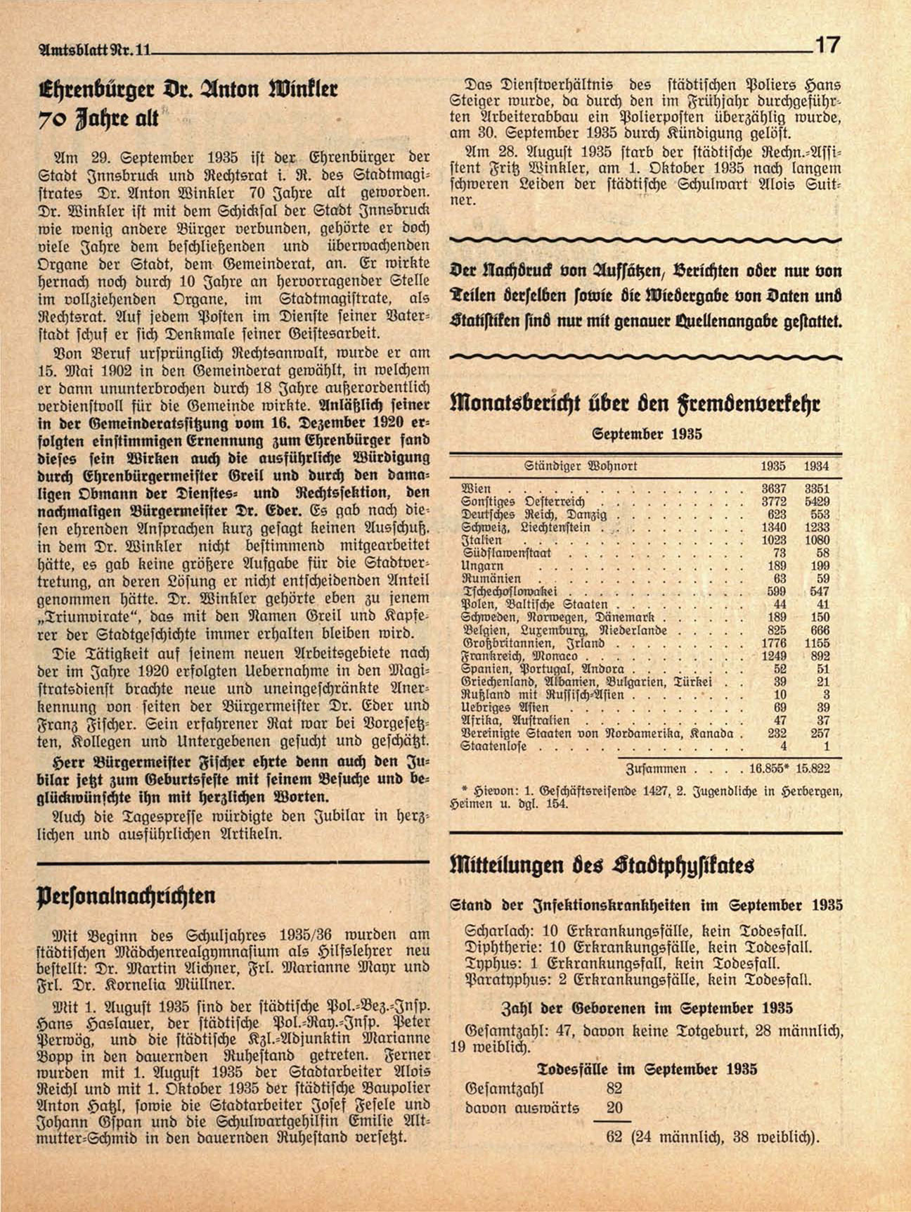 Stadt Innsbruck und Rechtsrat i. R. des Stadtmagistrates Dr. Anton Winkler 70 Jahre alt geworden.
