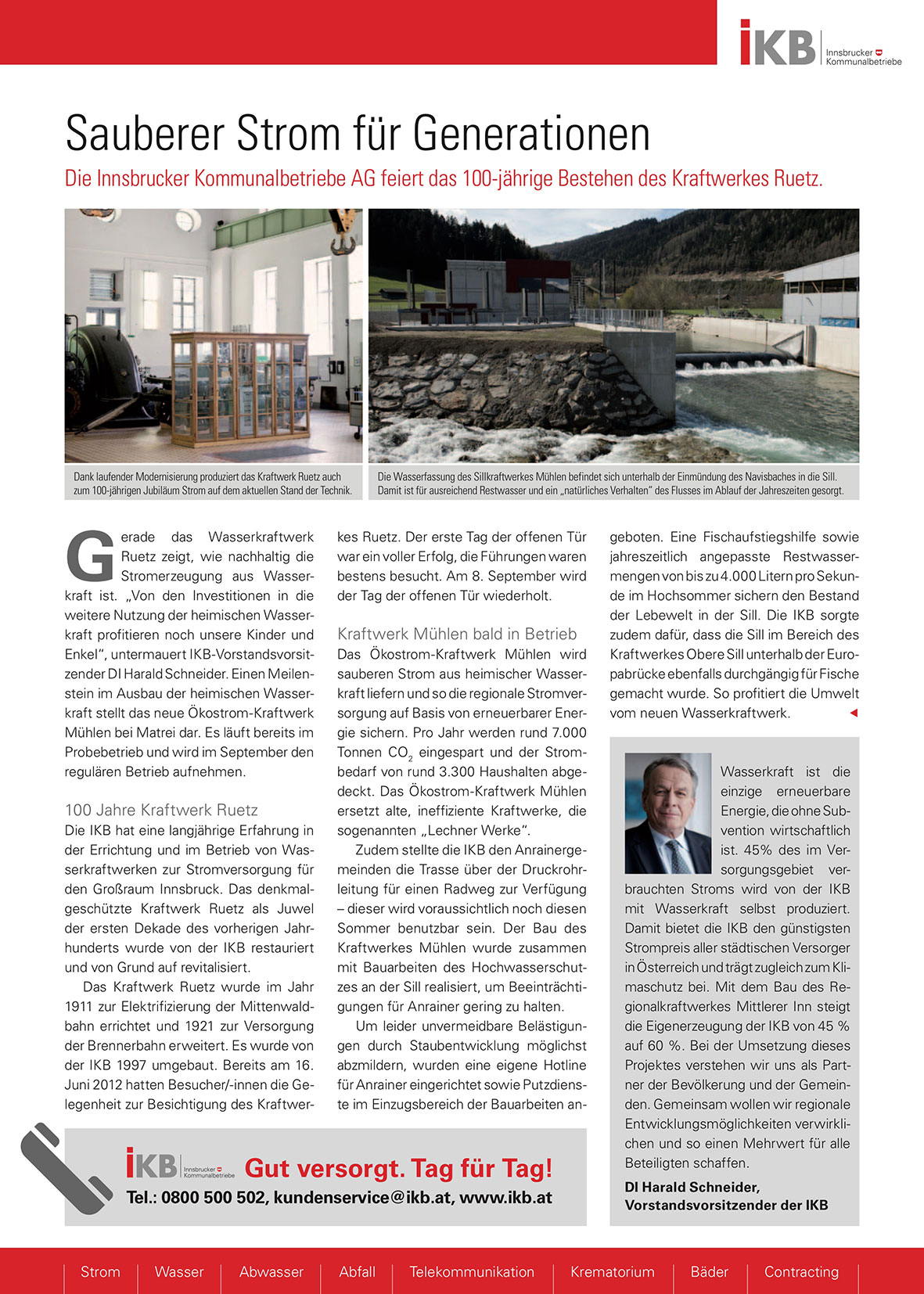 Enkel“, untermauert IKB-Vorstandsvorsitzender DI Harald Schneider. Einen Meilenstein im Ausbau der heimischen Wasserkraft stellt das neue Ökostrom-Kraftwerk