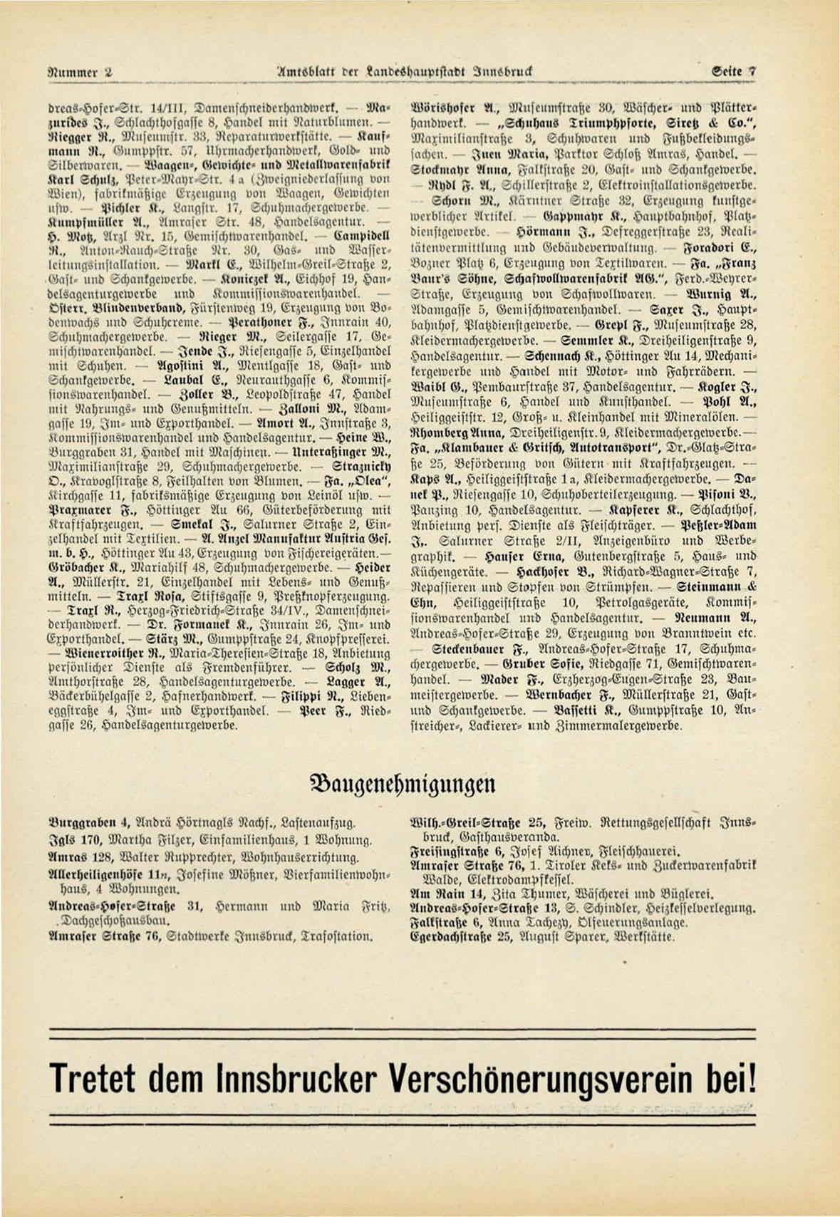 Stcckenbauer F., Nndrcas-Hofcr-Straßc 17, Schuhmachcrgcwerbe. — Gruber Sofie, Niedgasse 71, Gemischtwarenhandcl. — Mader ss., Erzherzog-Engcn-Straße 23, Baumeistcrgewcrbe. — Wernbacher F., Miillcrstrahe 21, Gastnnd Schankgewerbe. — Bassetti K., Gllmppstraße 10, Anstreicher-, Lackierer- und Zimmermalergewerbe.