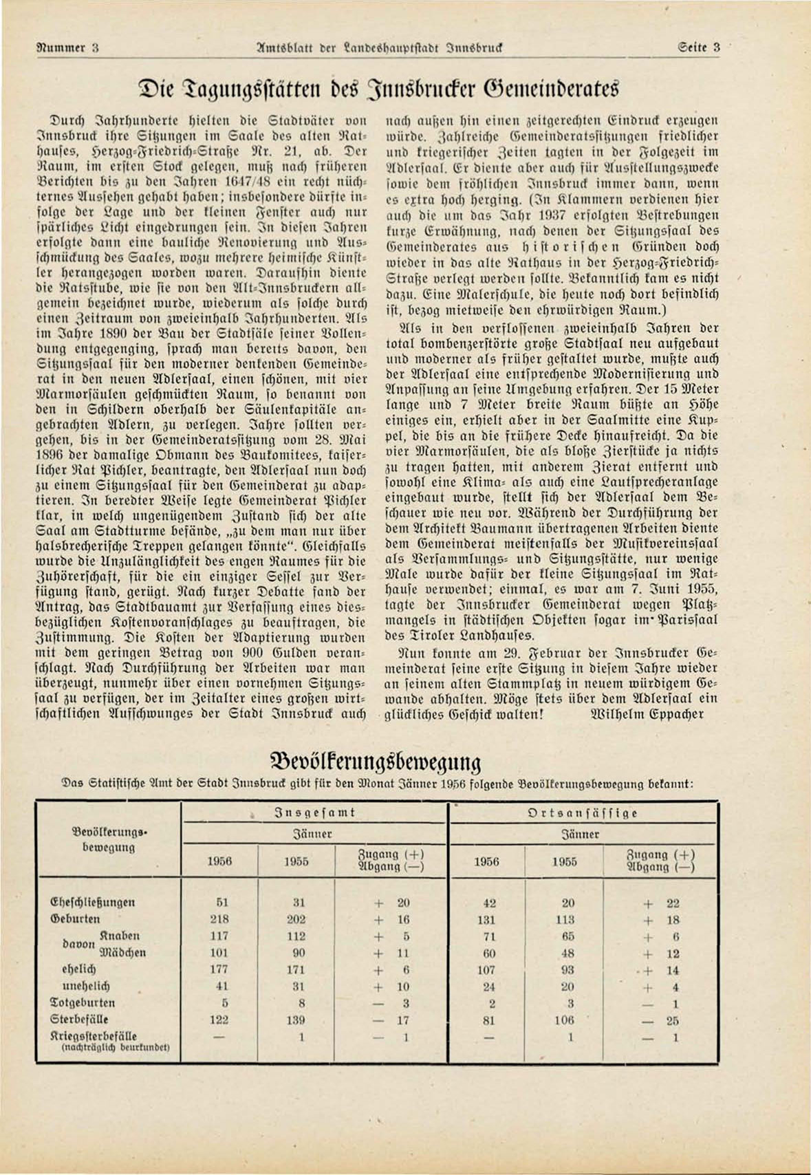 Das Statistische Amt der Stadt Innsbruck gibt für den Monat Jänner 1956 folgende Bevölkerungsbewegung bekannt:
