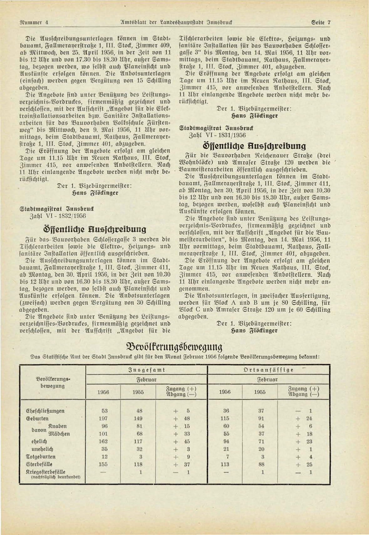 Das Statistische Amt der Stadt Innsbruck gibt fUr den Monat Februar 1956 folgende Veoölkerungsbewegung bekannt: