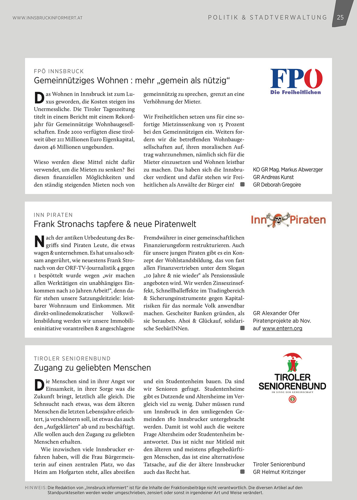 H i n w e i S : Die Redaktion von „innsbruck informiert“ ist für die inhalte der Fraktionsbeiträge nicht verantwortlich. Die diversen Artikel auf den