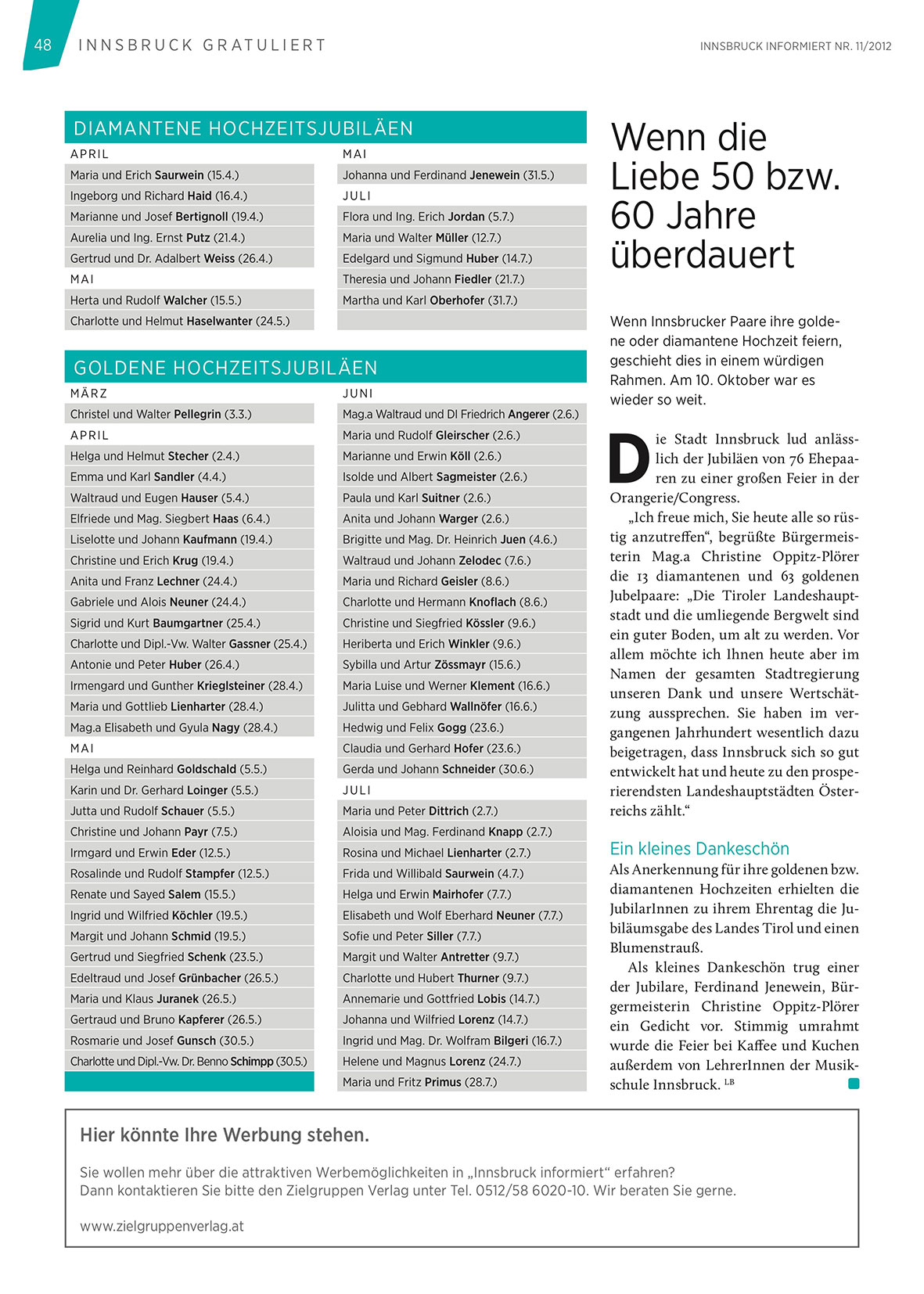 Wenn Innsbrucker Paare ihre goldene oder diamantene Hochzeit feiern,