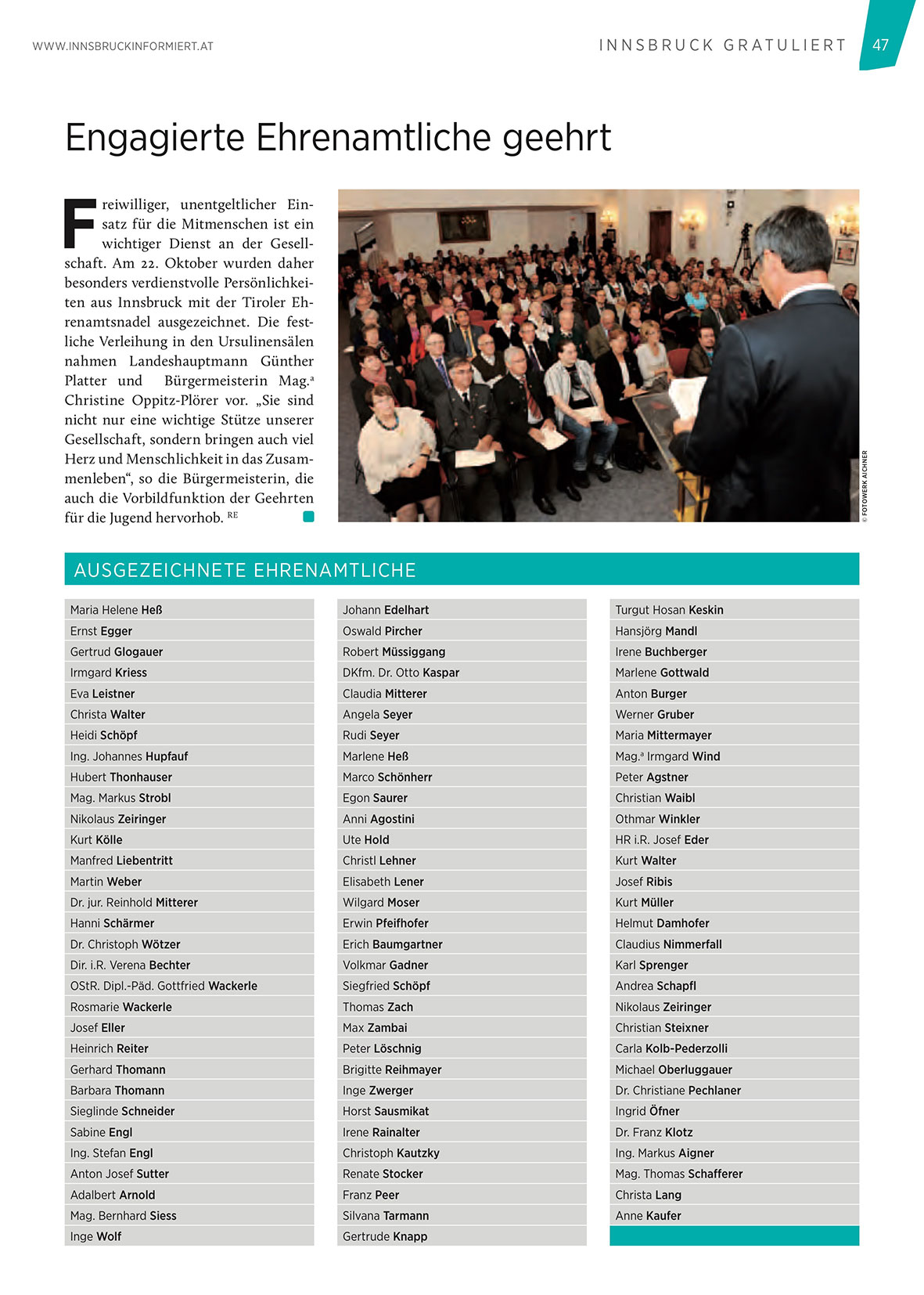 besonders verdienstvolle Persönlichkeiten aus Innsbruck mit der Tiroler Ehrenamtsnadel ausgezeichnet. Die festliche Verleihung in den Ursulinensälen