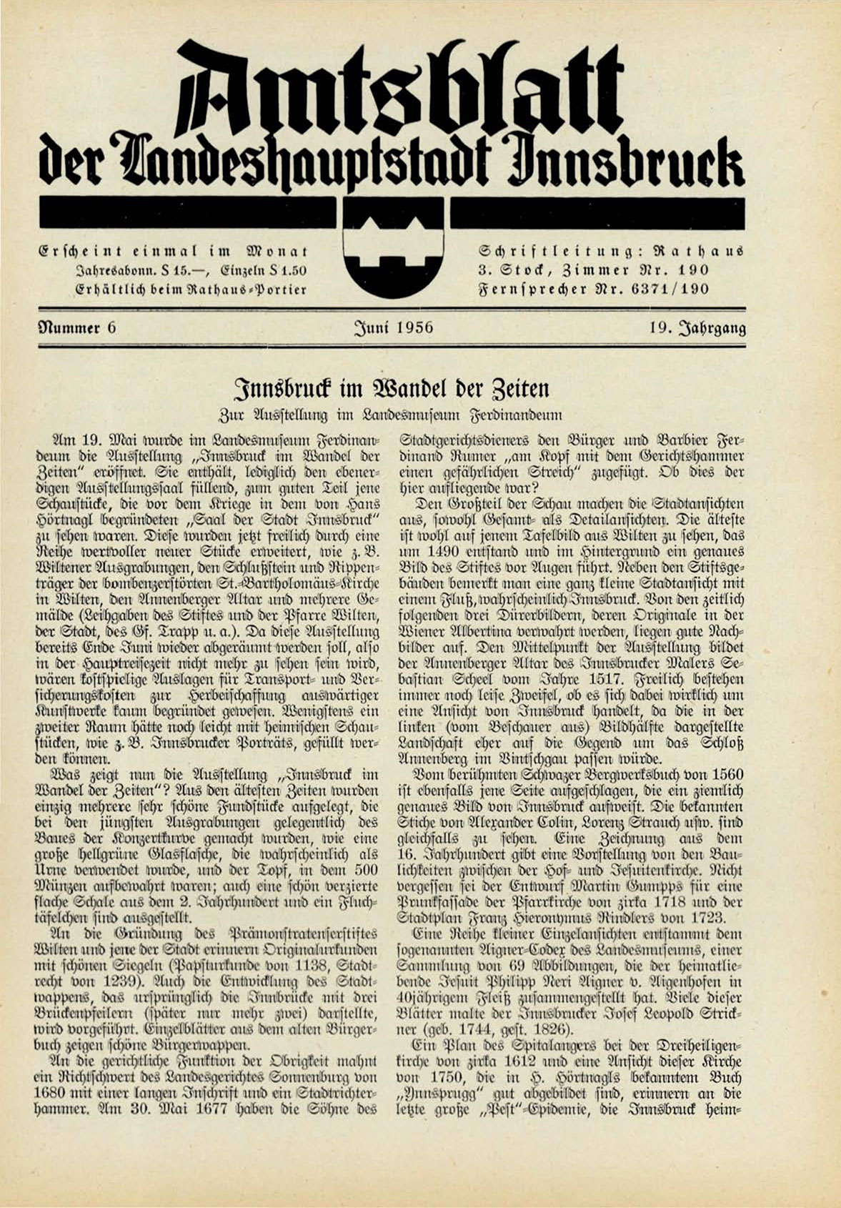 Am 19. Mai wurde im Oandeslnn!seum Ferdina,n- Stadtgerichtsdieners den GüvaM und Barbileic Ferdenm die ^lnsstellnnlg „Innsbruck i!in Wandel der dinaud Nnmer „ani Kopf mit dem Gerichtshammel