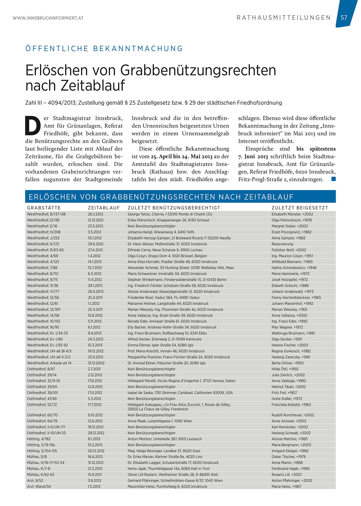 Bekanntmachung in der Zeitung „Innsbruck informiert“ im Mai 2013 und im