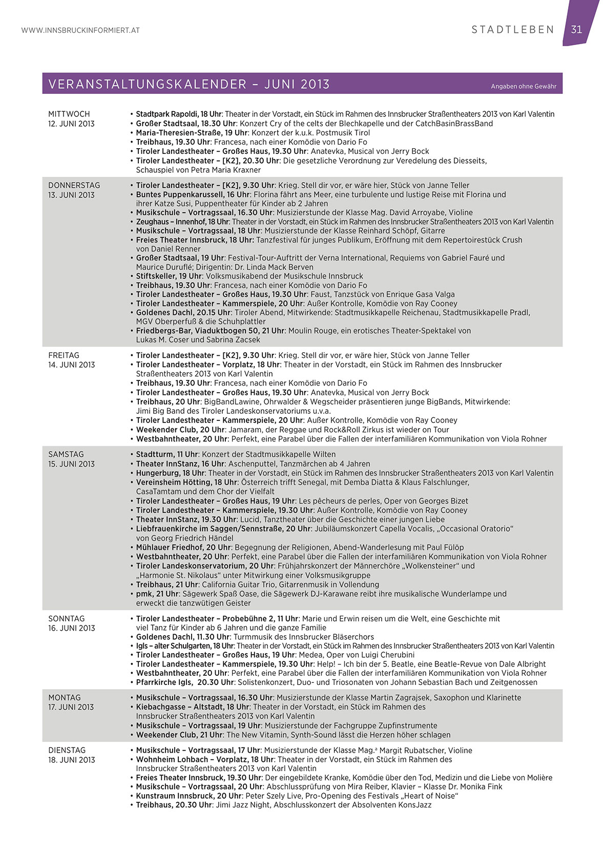 • Zeughaus – Innenhof, 18 Uhr: Theater in der Vorstadt, ein Stück im Rahmen des Innsbrucker Straßentheaters 2013 von Karl Valentin