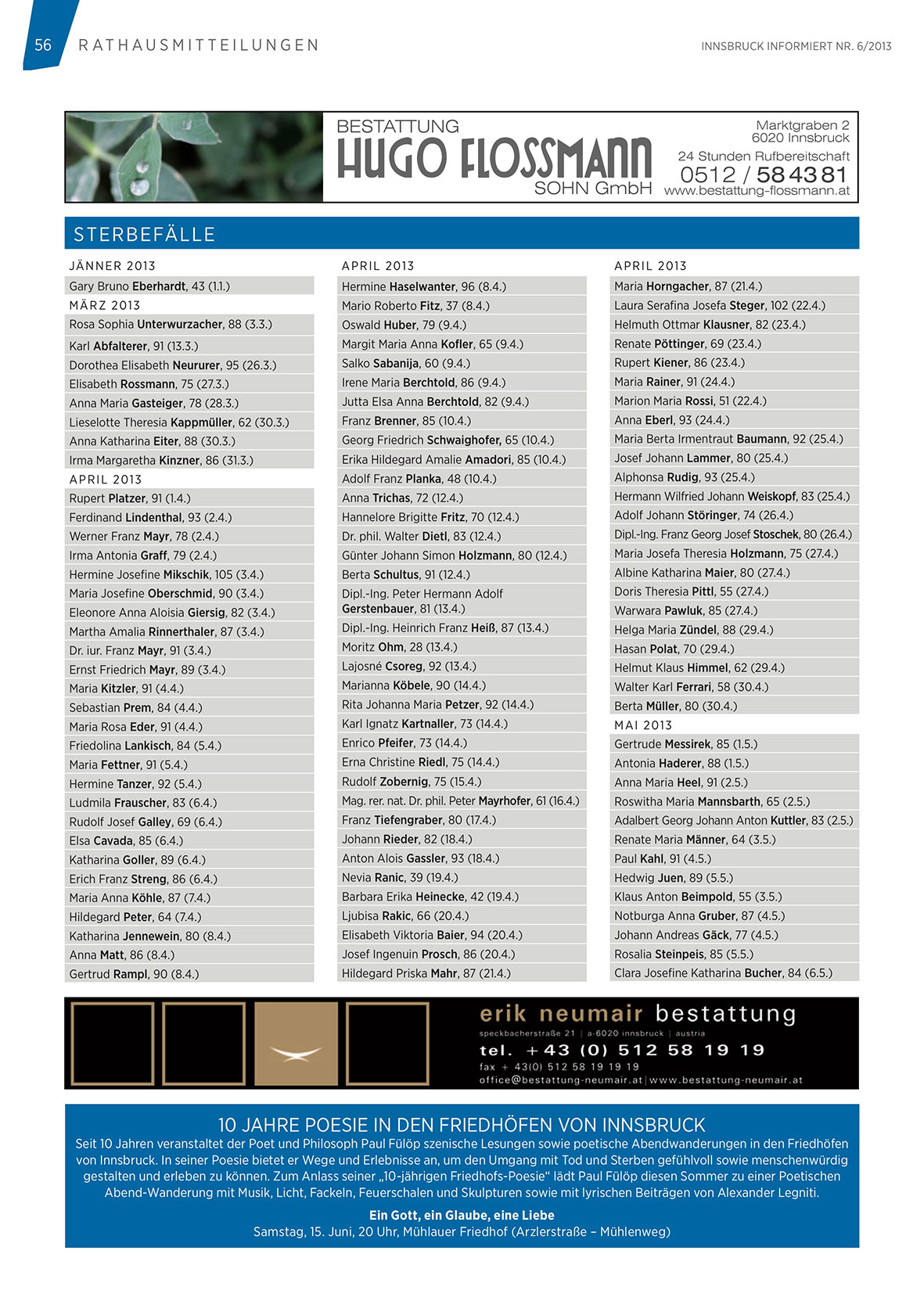 von Innsbruck. In seiner Poesie bietet er Wege und Erlebnisse an, um den Umgang mit Tod und Sterben gefühlvoll sowie menschenwürdig