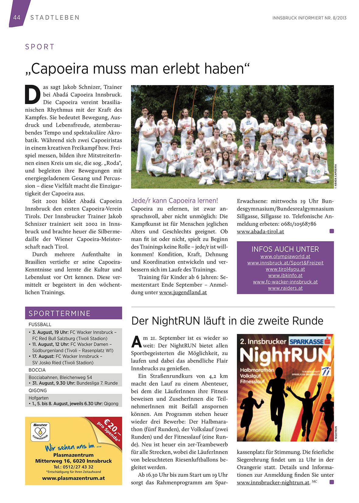 Schnizer trainiert seit 2002 in Innsbruck und brachte heuer die Silbermedaille der Wiener Capoeira-Meisterschaft nach Tirol.