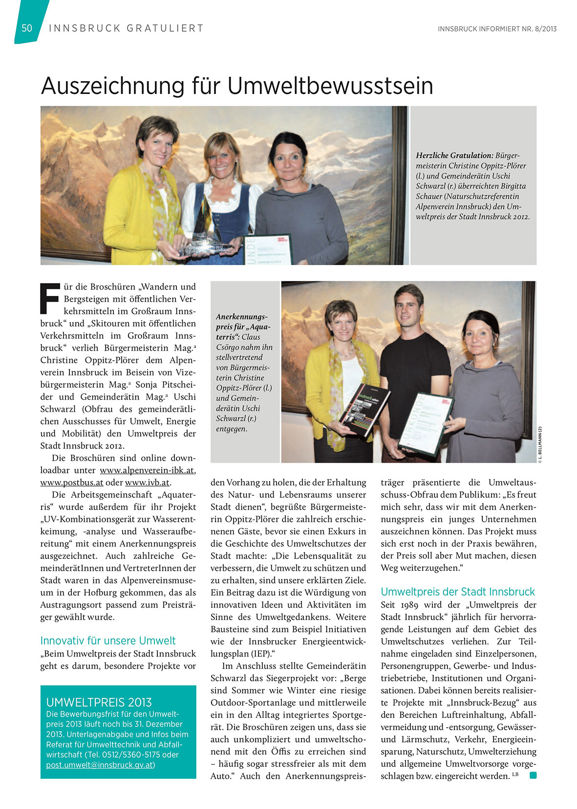 Alpenverein Innsbruck) den Umweltpreis der Stadt Innsbruck 2012.