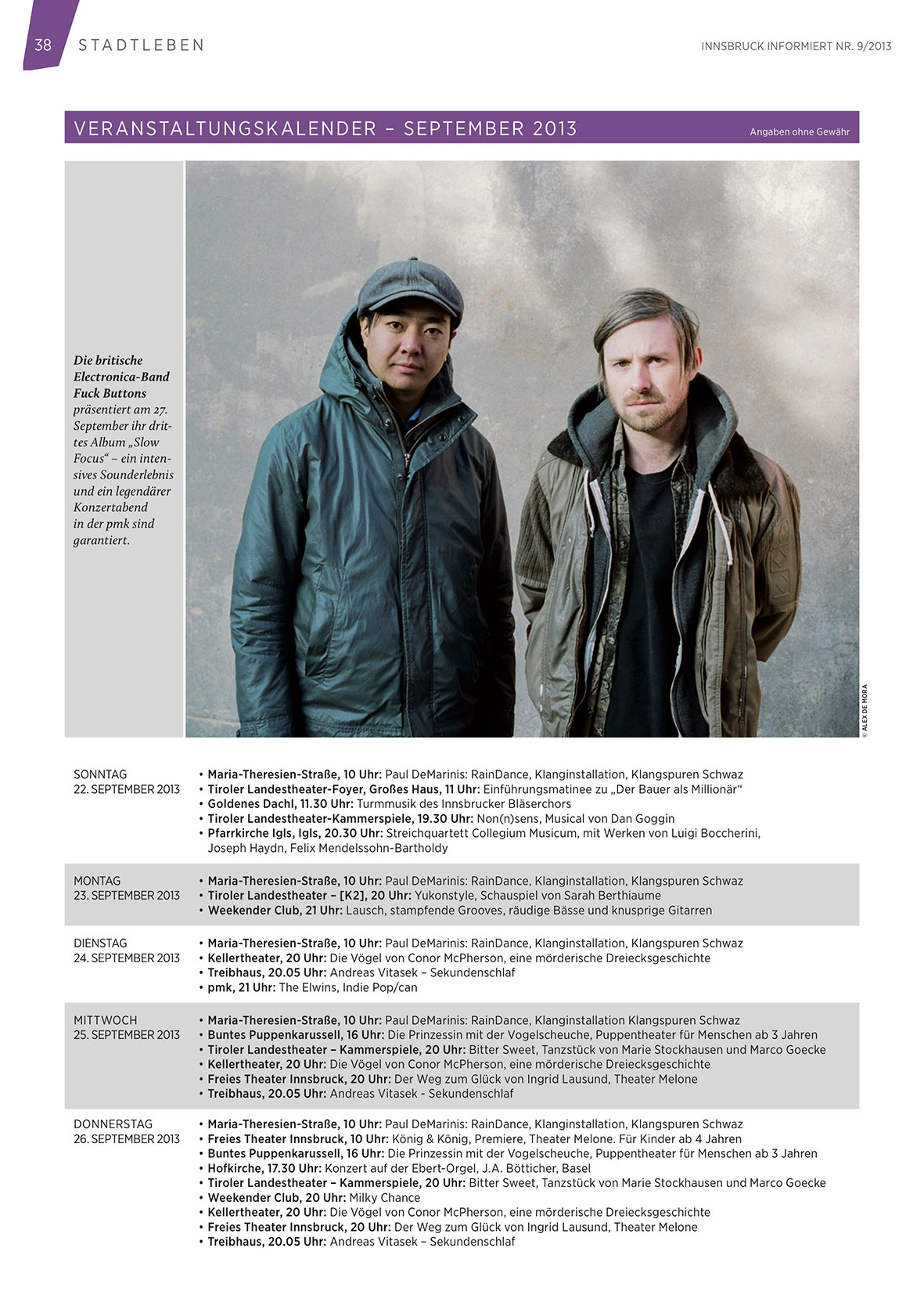 • Maria-Theresien-Straße, 10 Uhr: Paul DeMarinis: RainDance, Klanginstallation, Klangspuren Schwaz