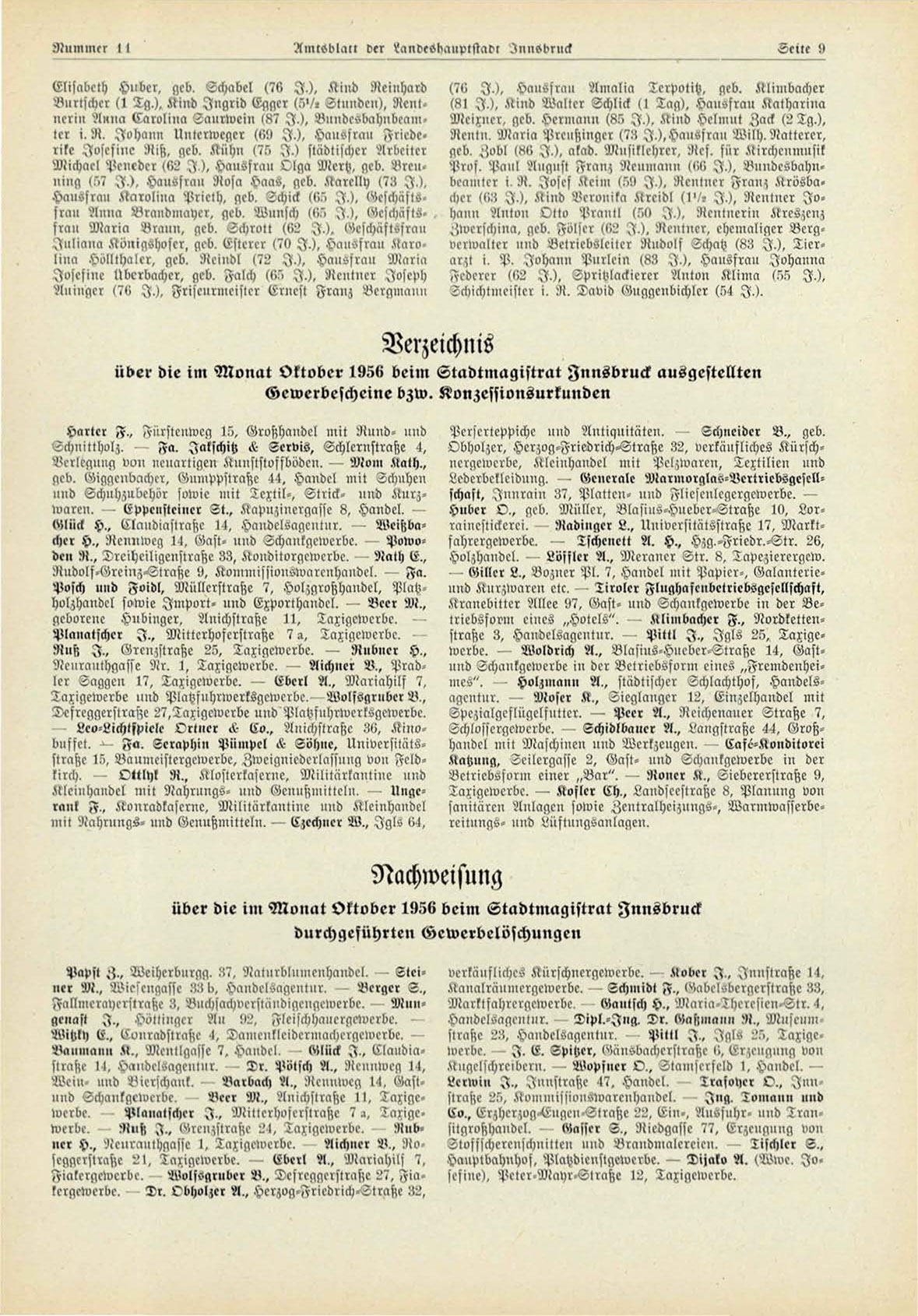 über die im Monat öktober 1956 beim Stadtmagistrat Innsbruck ausgestellten
