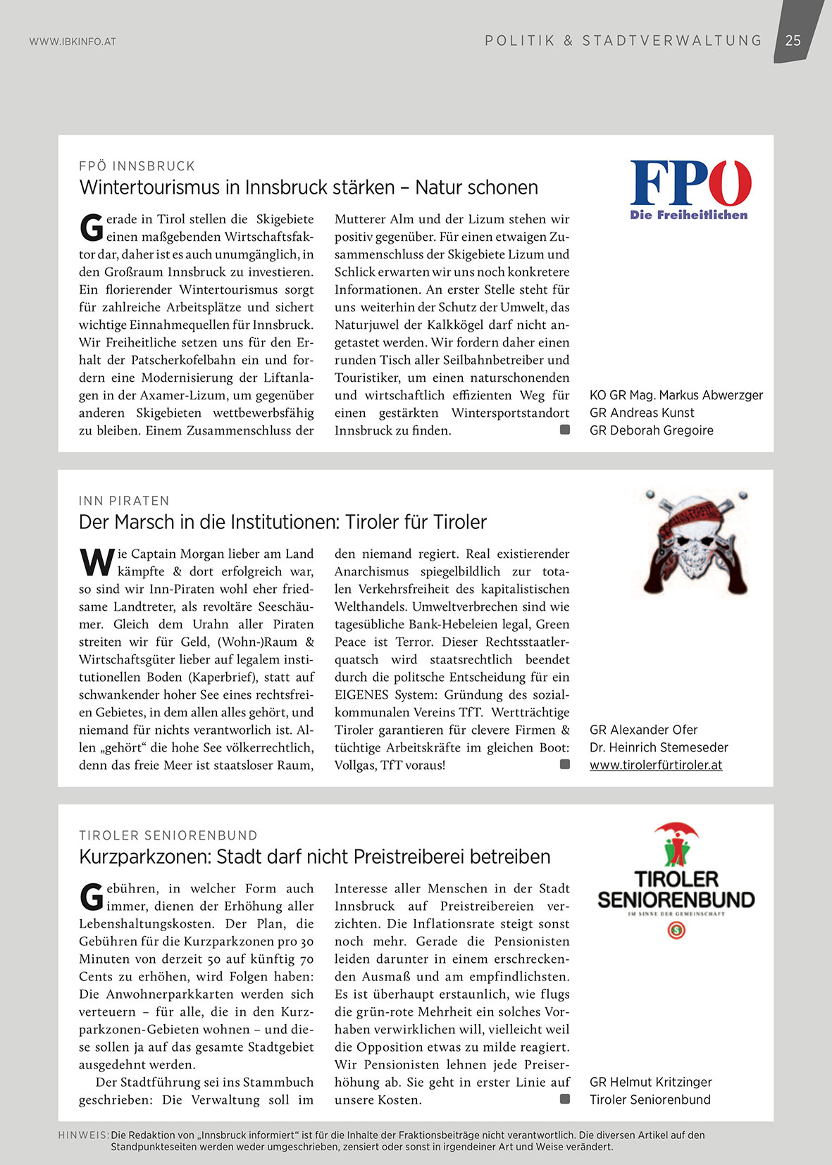 H i n W e i s : Die redaktion von „innsbruck informiert“ ist für die inhalte der fraktionsbeiträge nicht verantwortlich. Die diversen artikel auf den