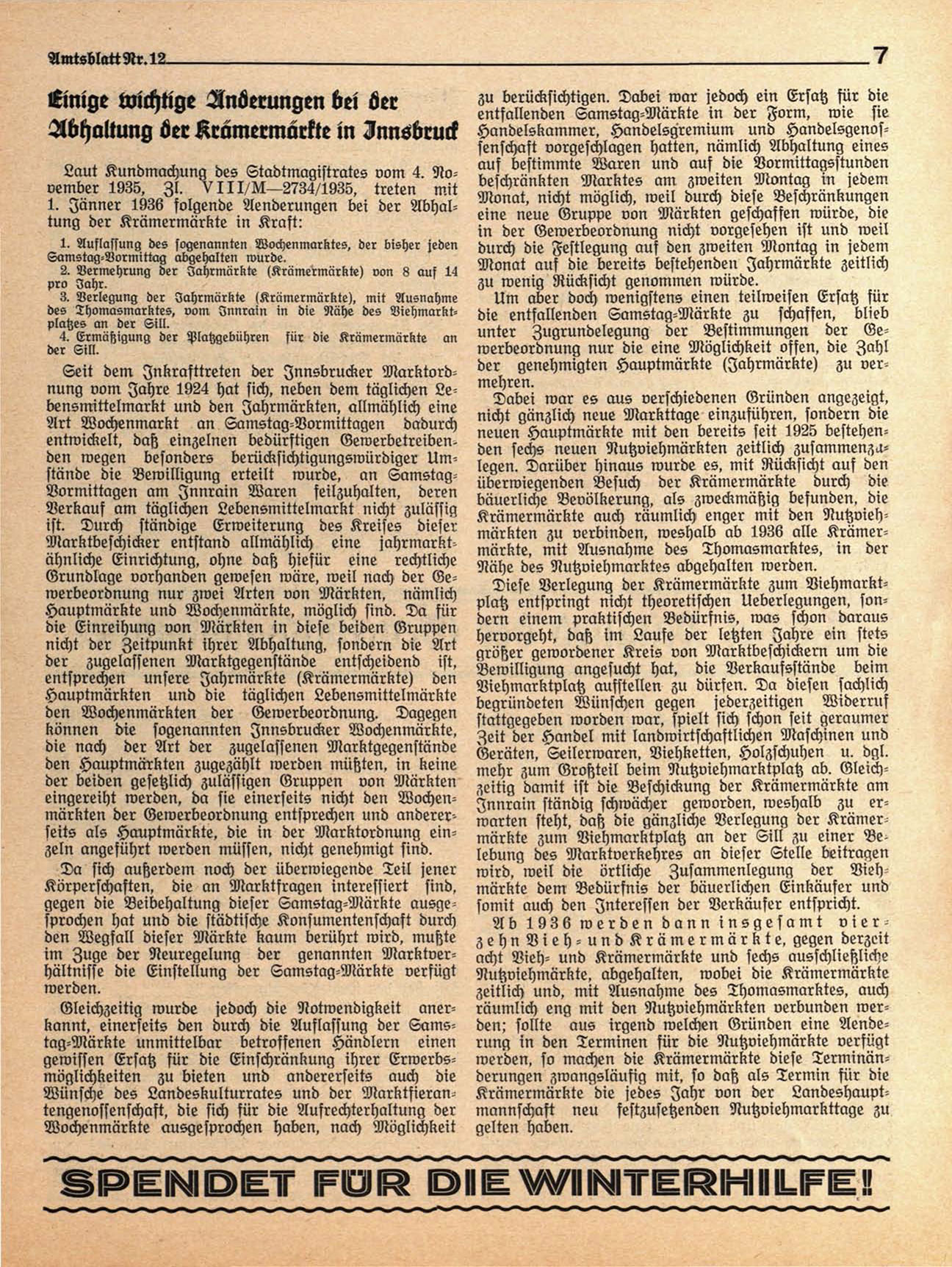 1. Jänner 1936 folgende Aenderungen bei der Abhaltung der Krämermärkte in Kraft: